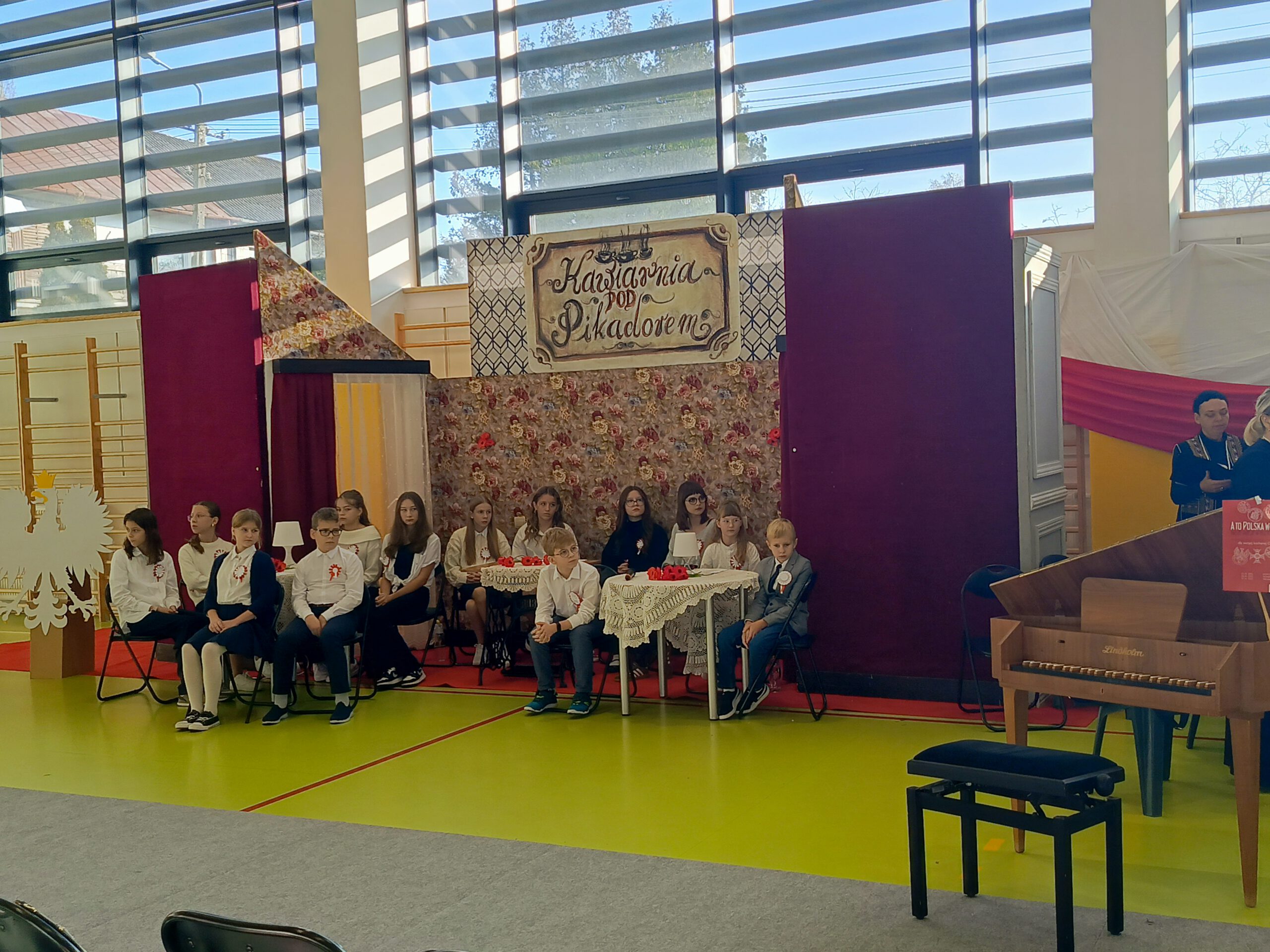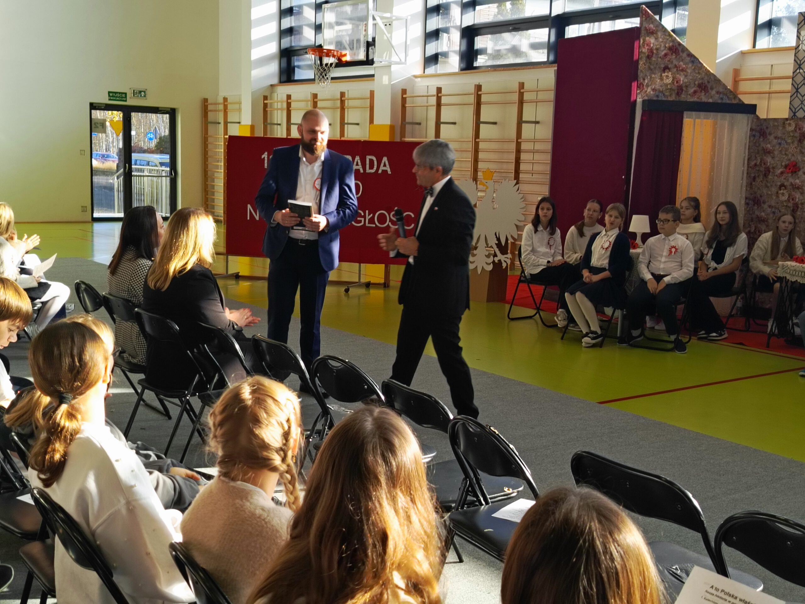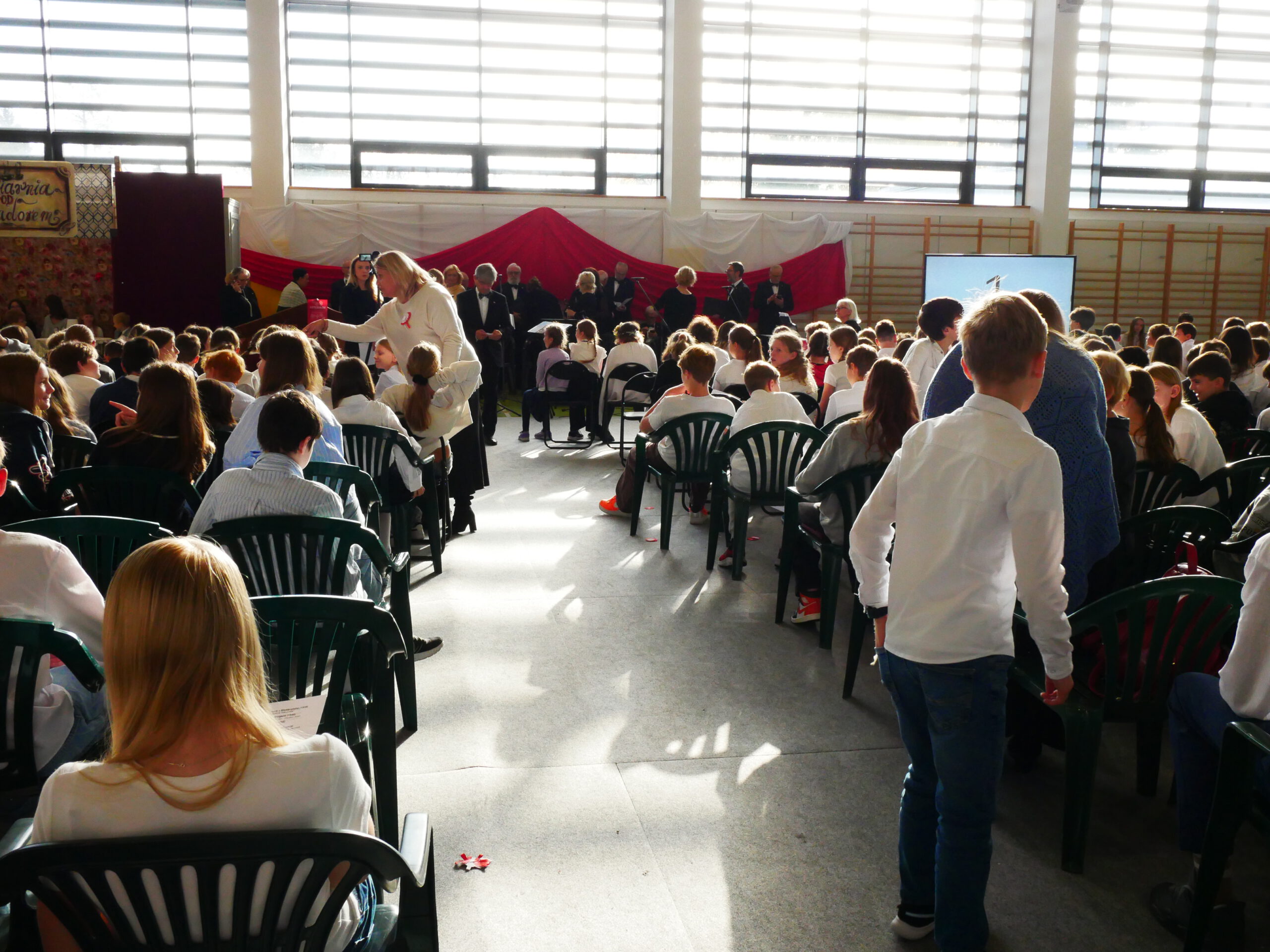 Z tej okazji, w naszej szkole, 7 listopada odbył się uroczysty apel, który był dla wszystkich uczniów wspaniałą lekcją historii i patriotyzmu. Scenariusz od strony poetyckiej i narracyjnej przygotowała Pani Elżbieta Tomczak, a koncepcję muzyczną Pan Witold Błaszczyk i Komorowskie Towarzystwo Śpiewacze. Piękną dekorację wykonała pani Wioletta Mroczek oraz Pani Sylwia Tłoczkowska. Uczniowie recytowali wiersze Adama Asnyka, Ignacego Krasickiego, Juliusza Słowackiego, Leopolda Staffa oraz Konstantego Ildefonsa Gałczyńskiego. Program artystyczny odnosił się do trudnej historii naszego kraju – od początków polskiej państwowości, aż do czasów nam współczesnych. Uczniowie mogli usłyszeć Bogurodzicę, Rotę w wersji instrumentalnej, czy fragment koncertu Jankiela.