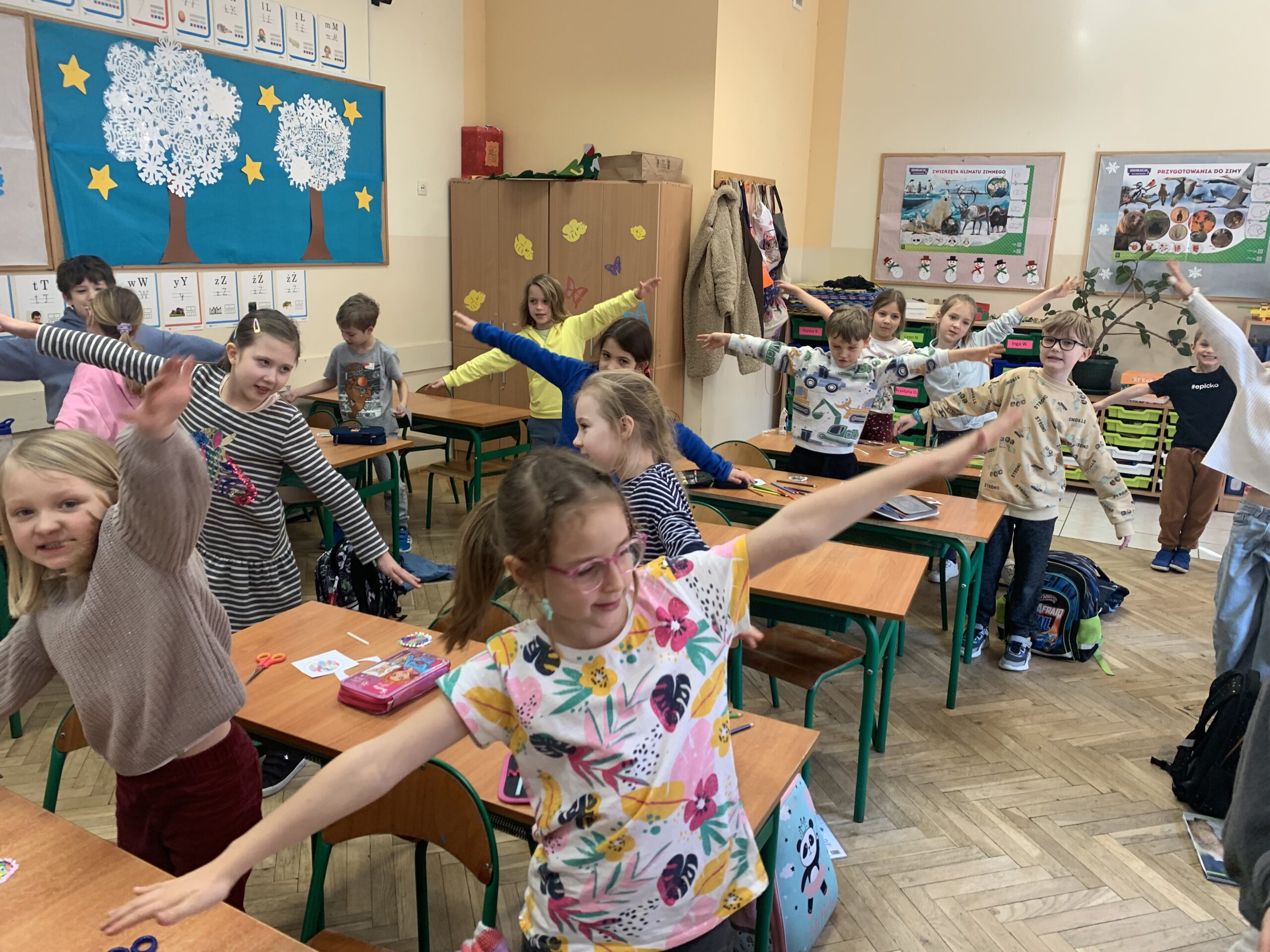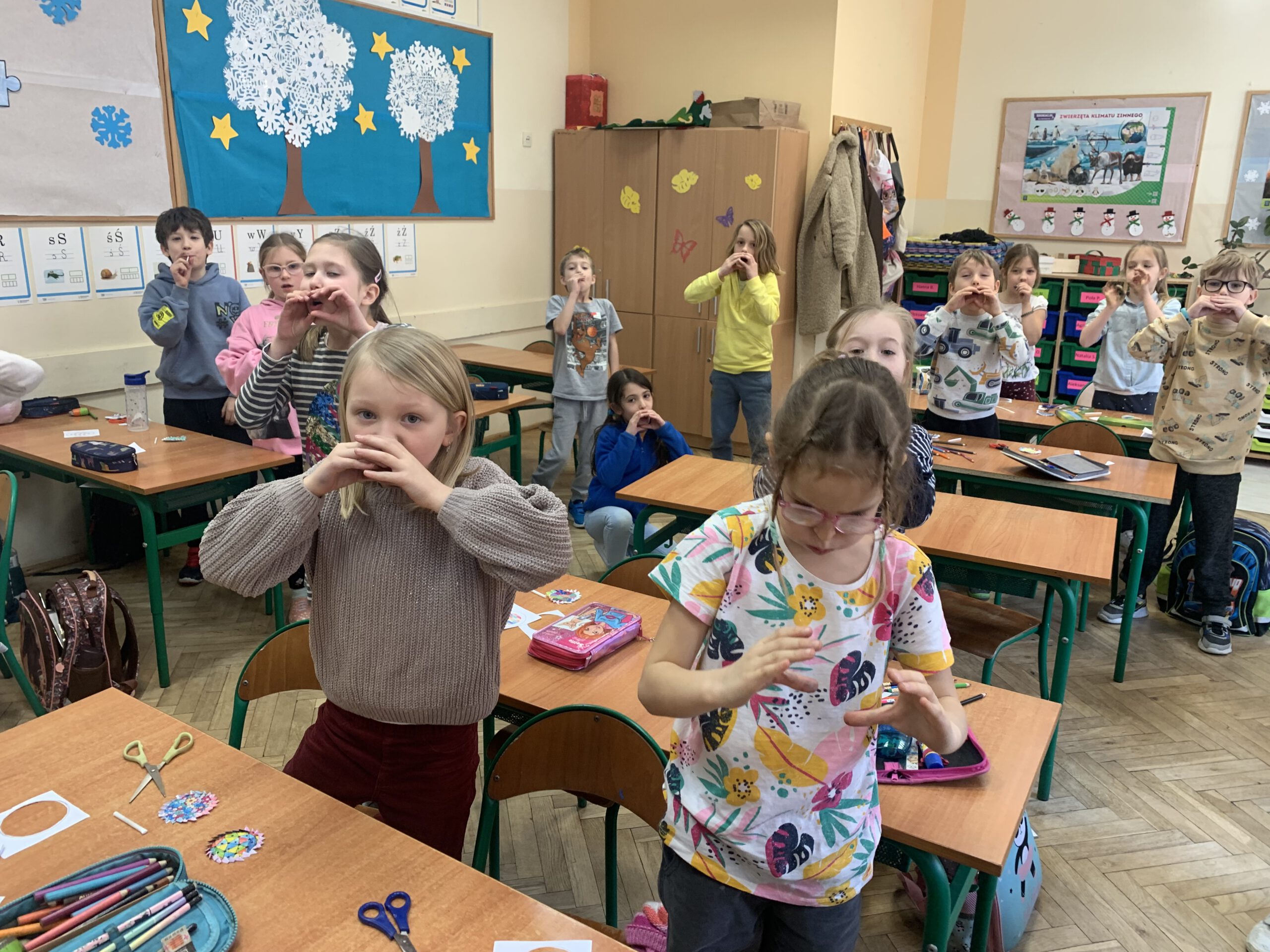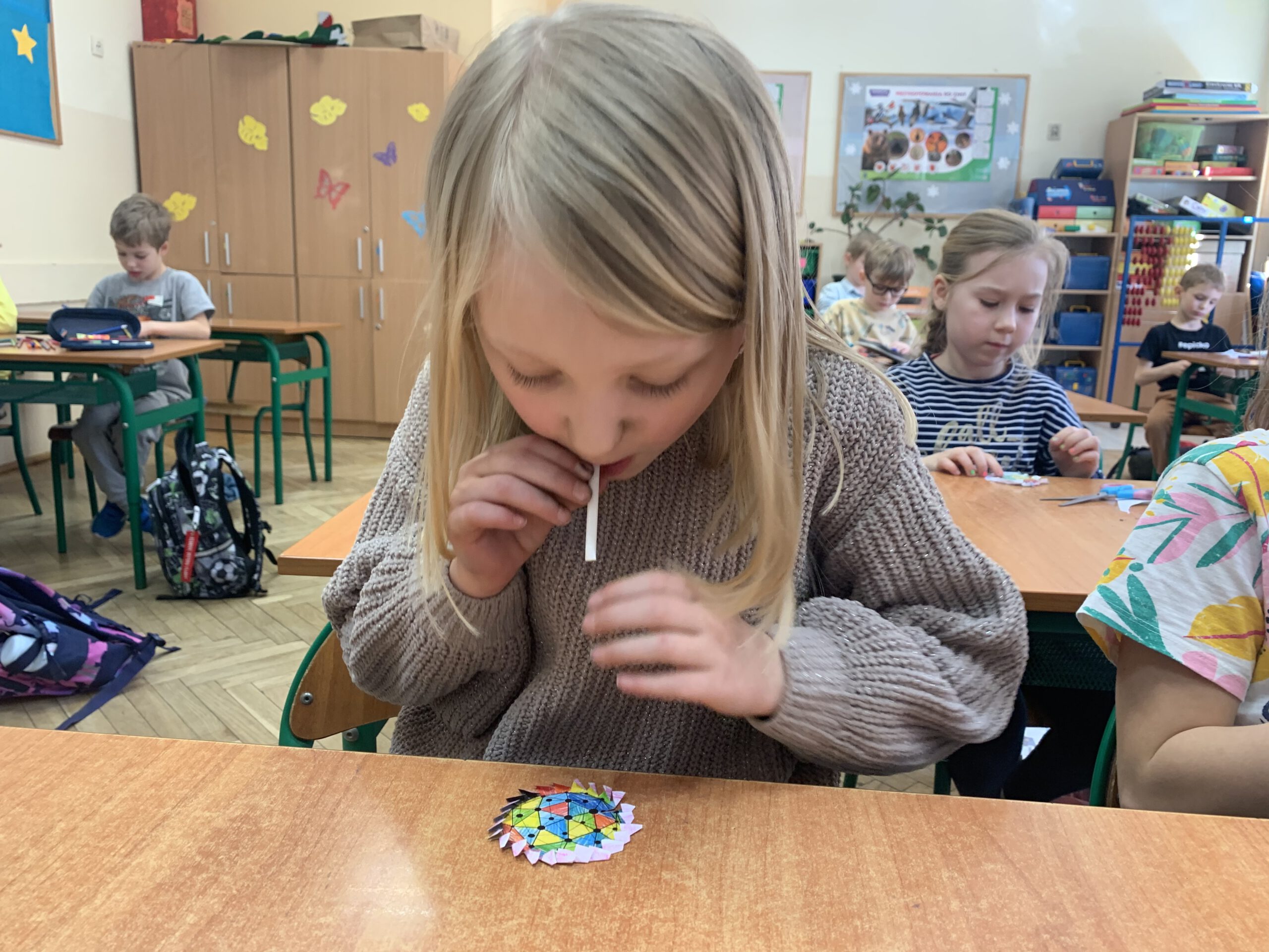 Dzieci z klas 0-1 wykonywały wiatraczki i ćwiczyły oddech, który odgrywa ważną rolę w procesie mówienia.