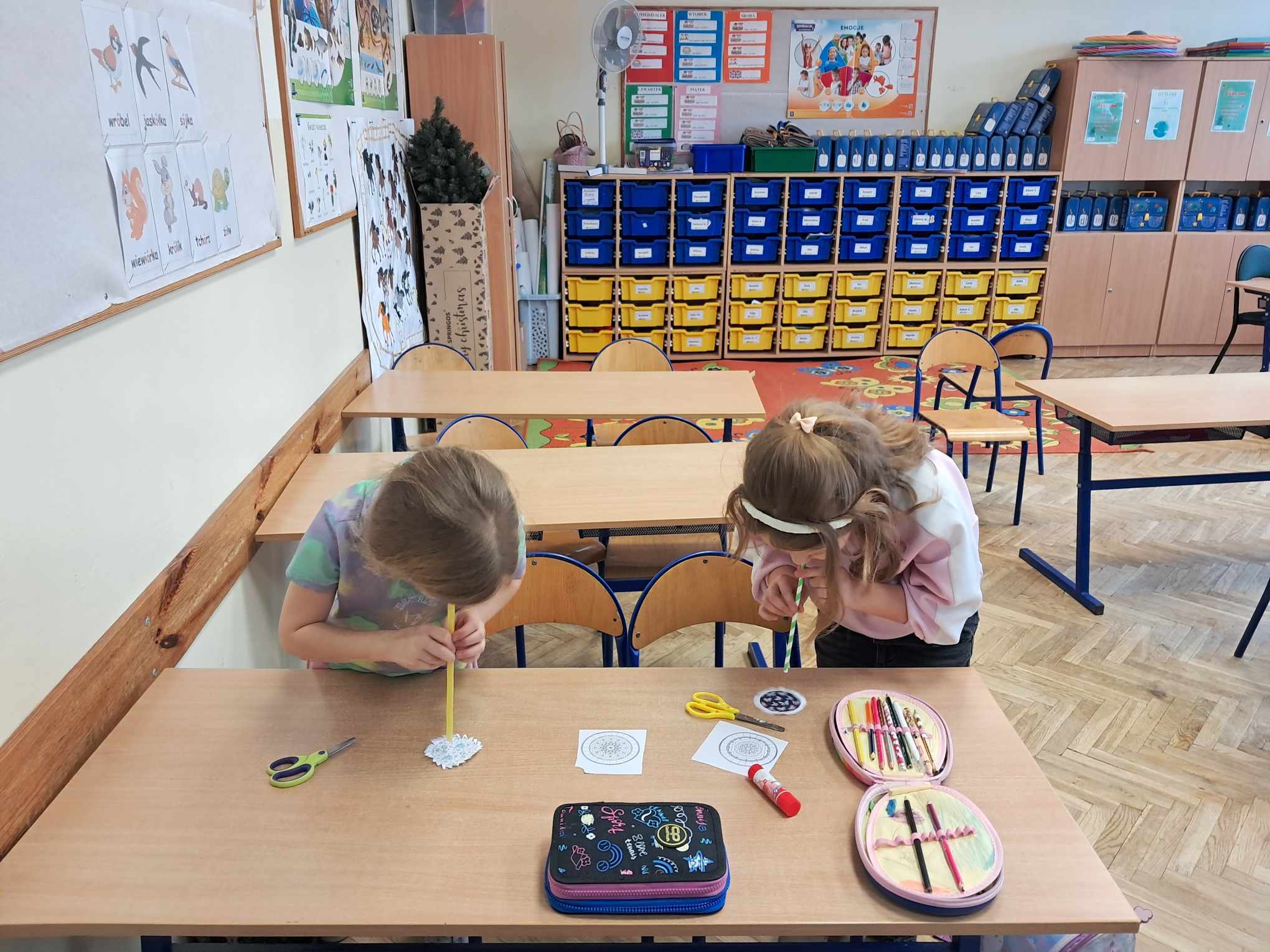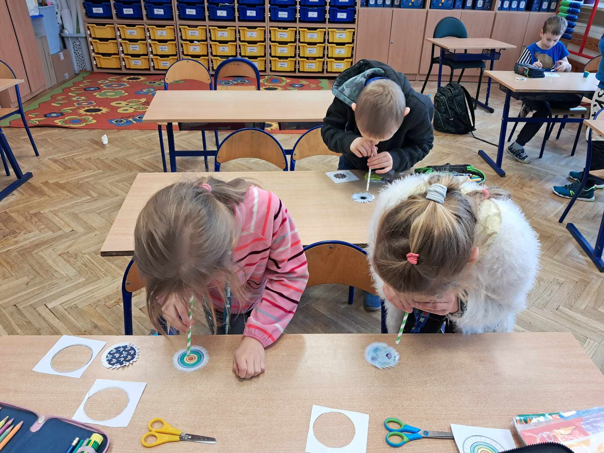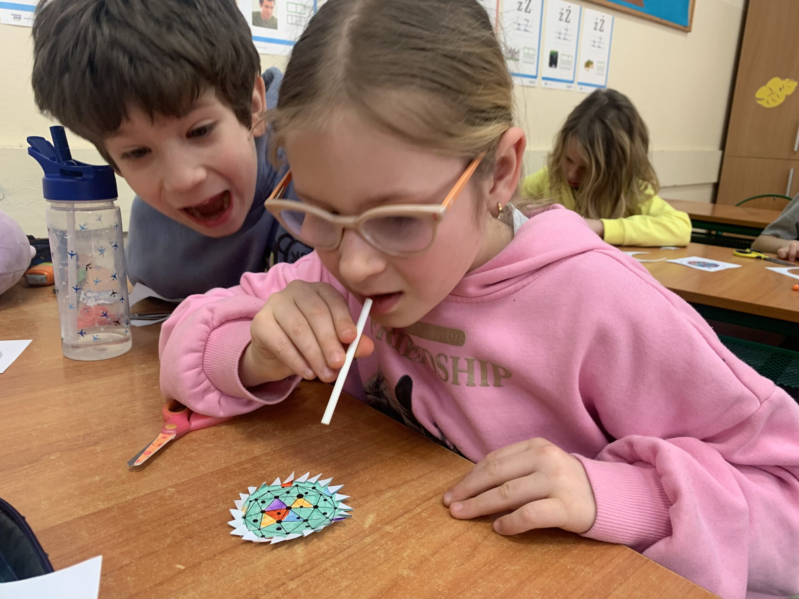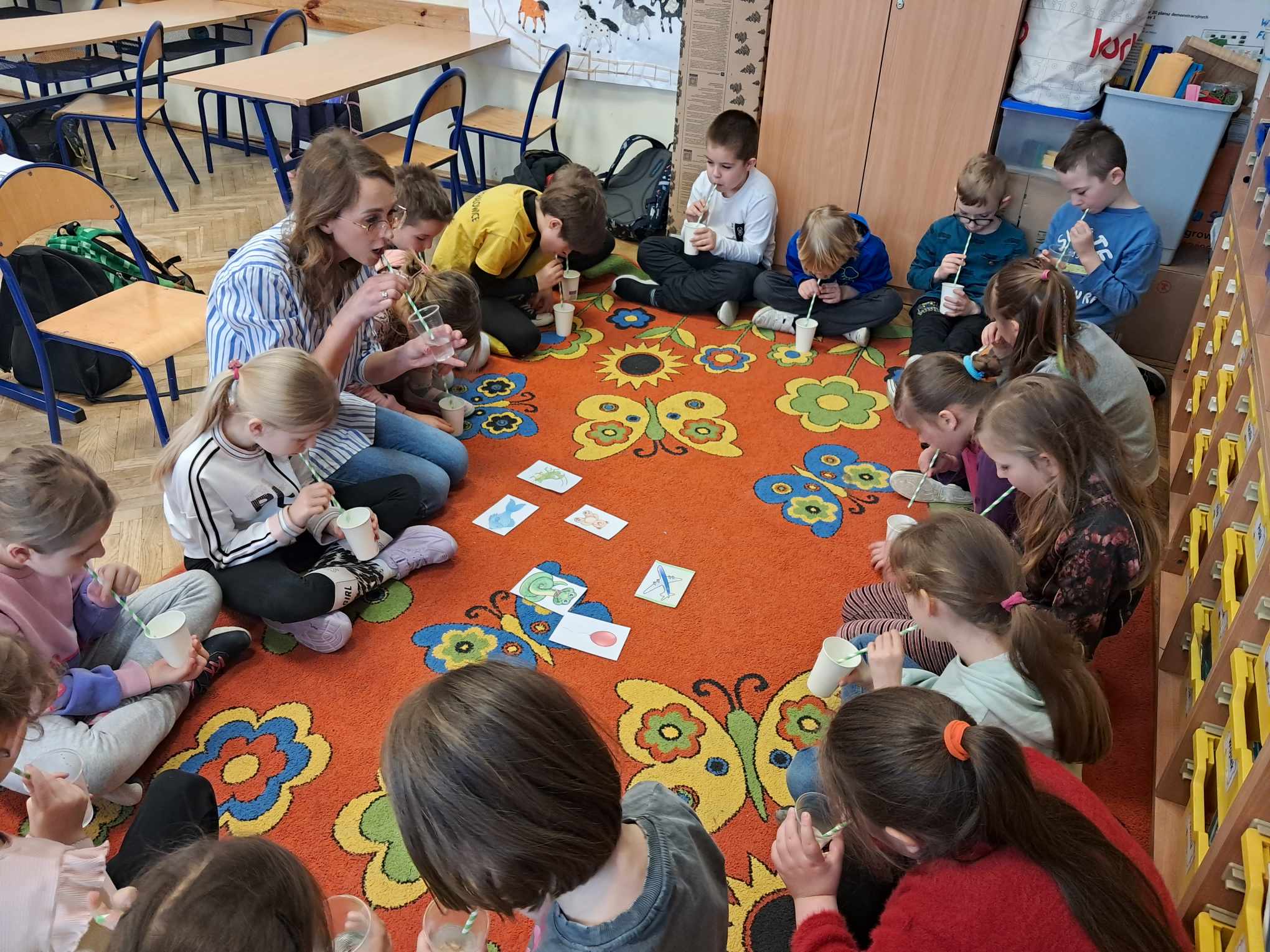 Dzieci z klas 0-1 wykonywały wiatraczki i ćwiczyły oddech, który odgrywa ważną rolę w procesie mówienia.