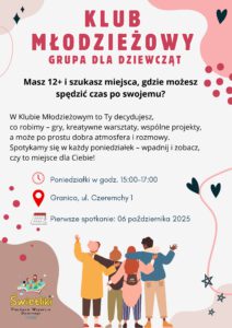 WięcejPlacówka Wsparcie Dziennego „Świetliki” zaprasza dziewczęta na spotkania Klubu Młodzieżowego. Plakat Klub Młodzieżowy