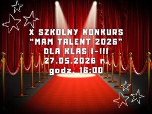 Serdecznie zapraszamy uczniów do udziału w X SZKOLNYM KONKURSIE „MAM TALENT 2026” Konkurs skierowany jest do uczniów klas I–III szkoły podstawowej, którzy chcą zaprezentować na forum swoje zainteresowania, pasje, hobby, osiągnięcia,…