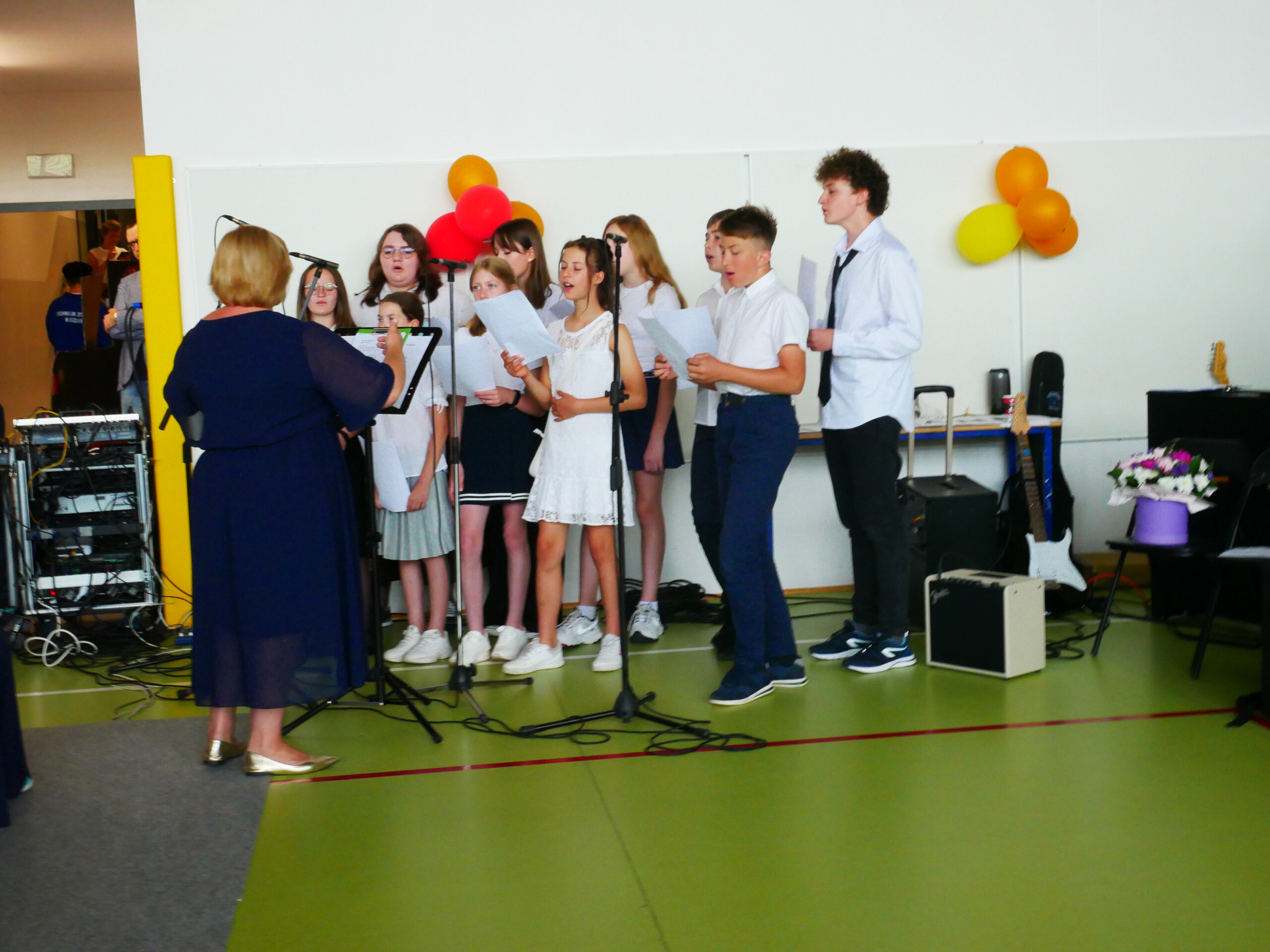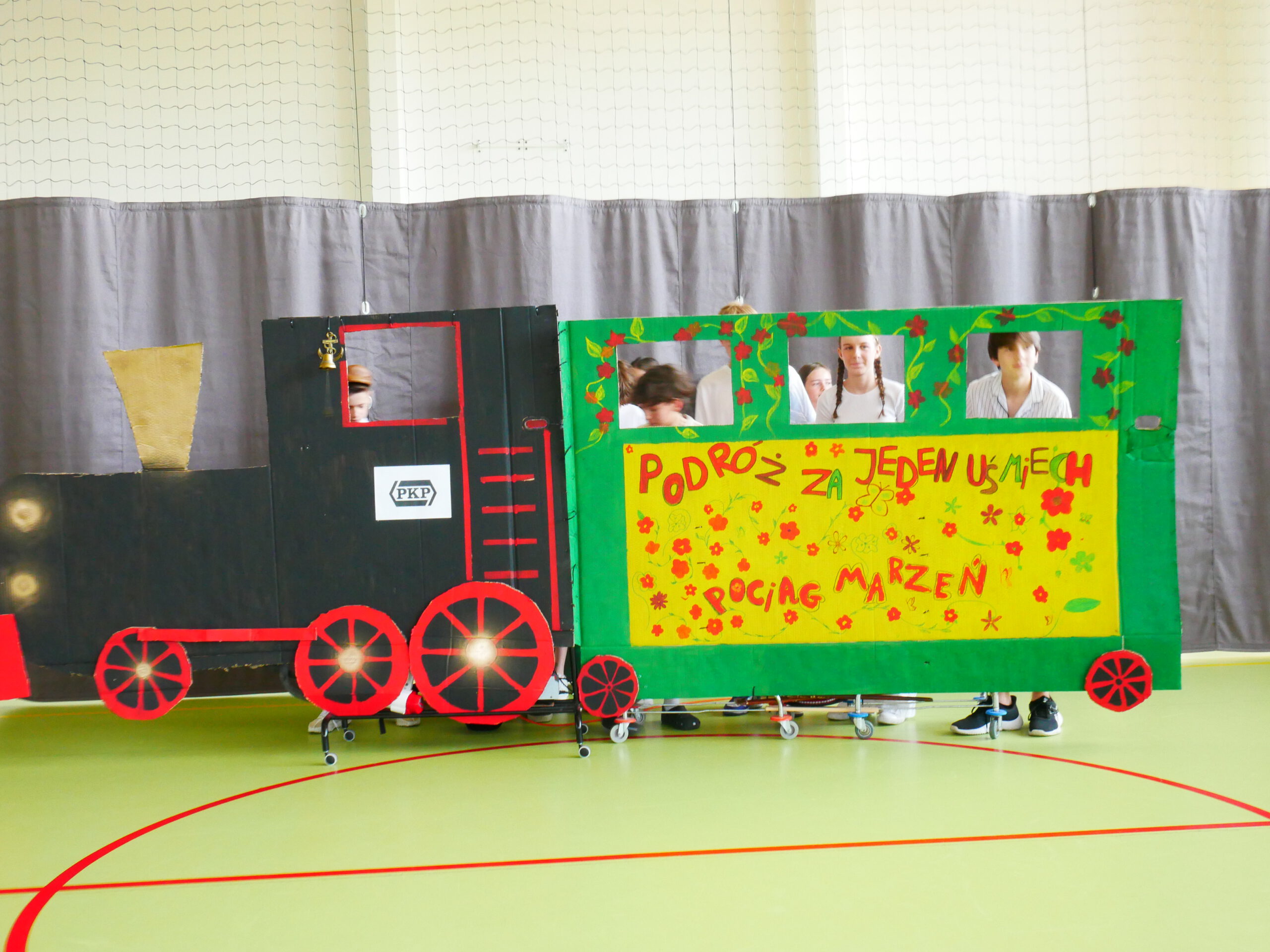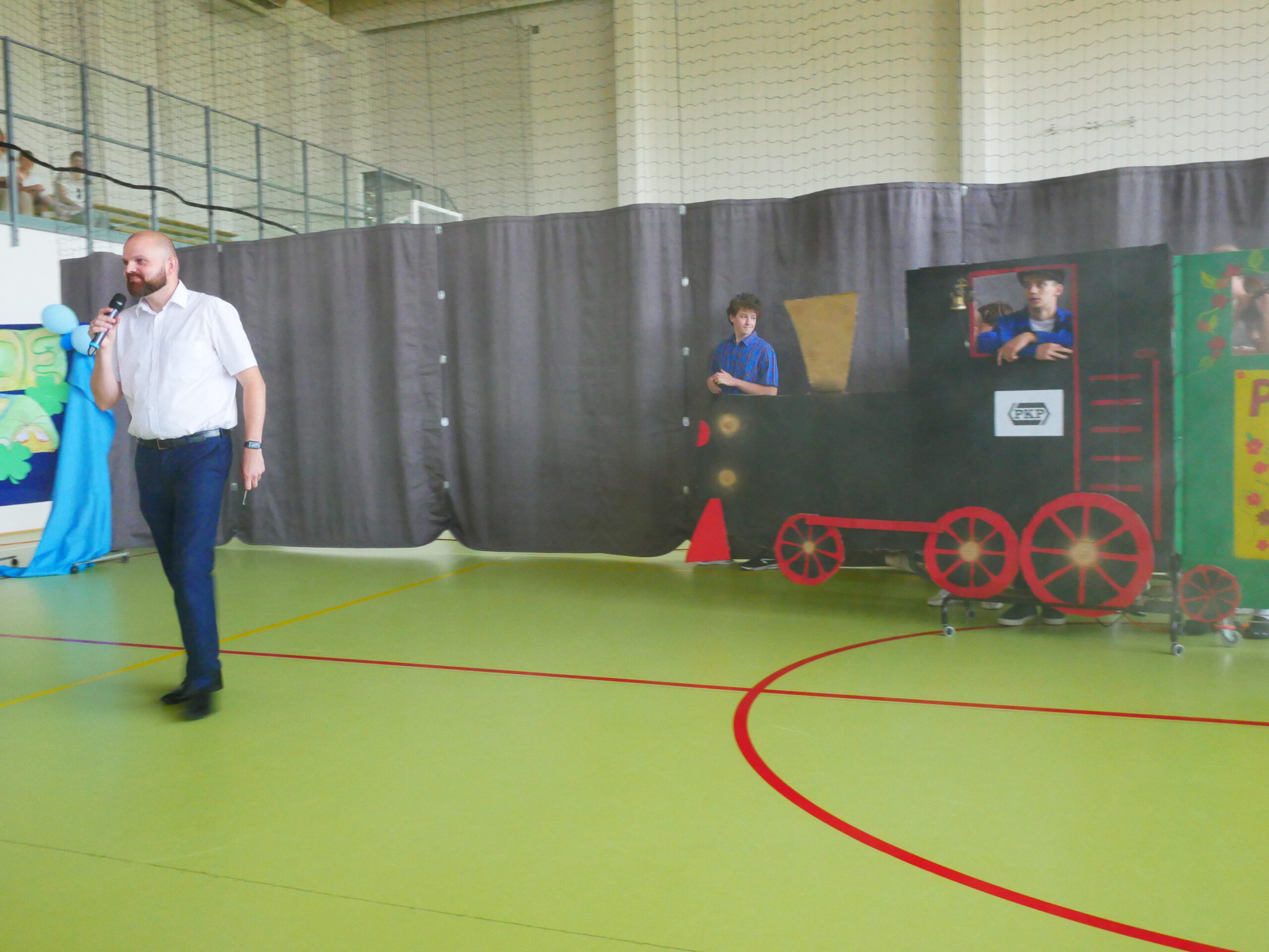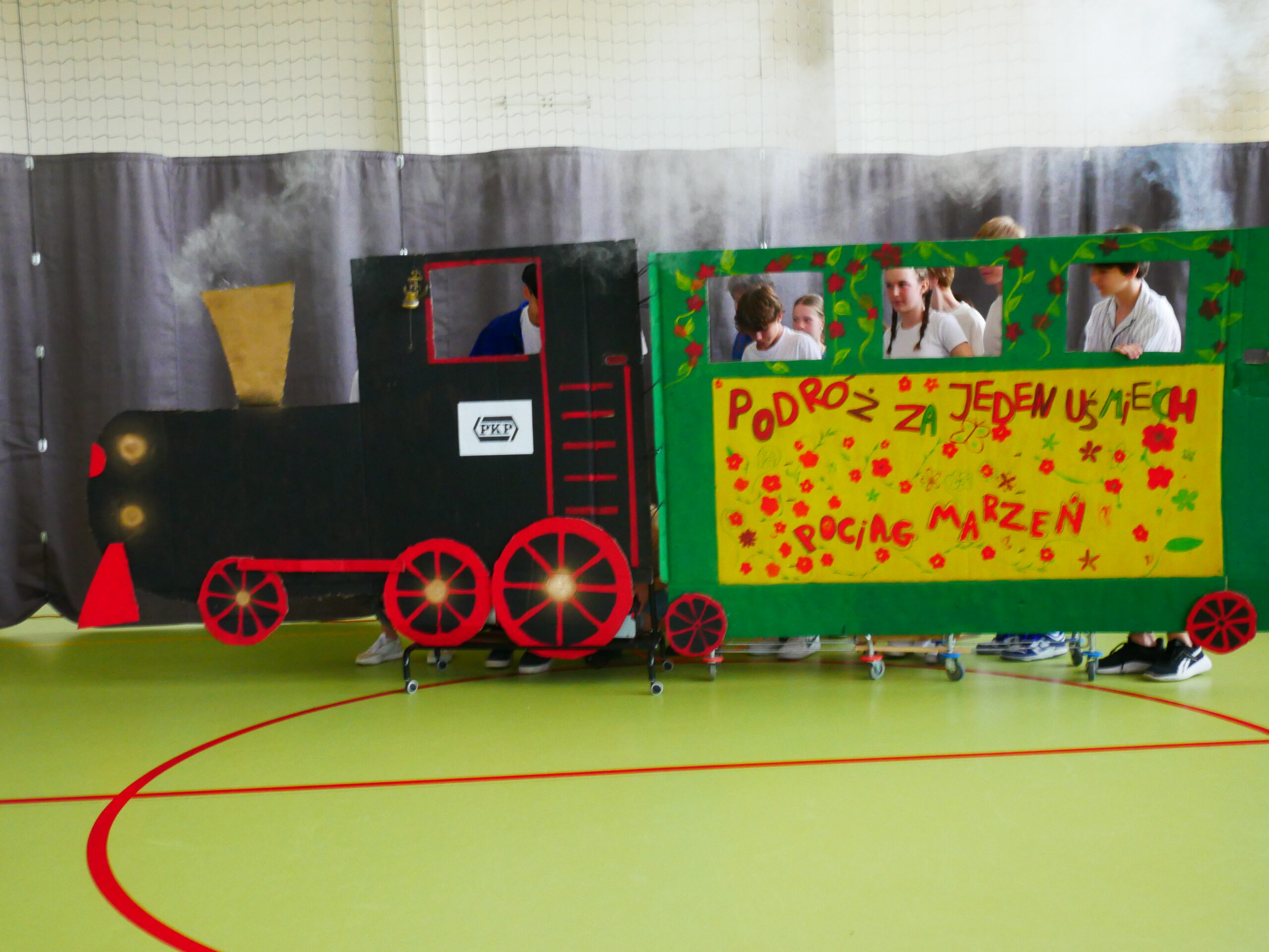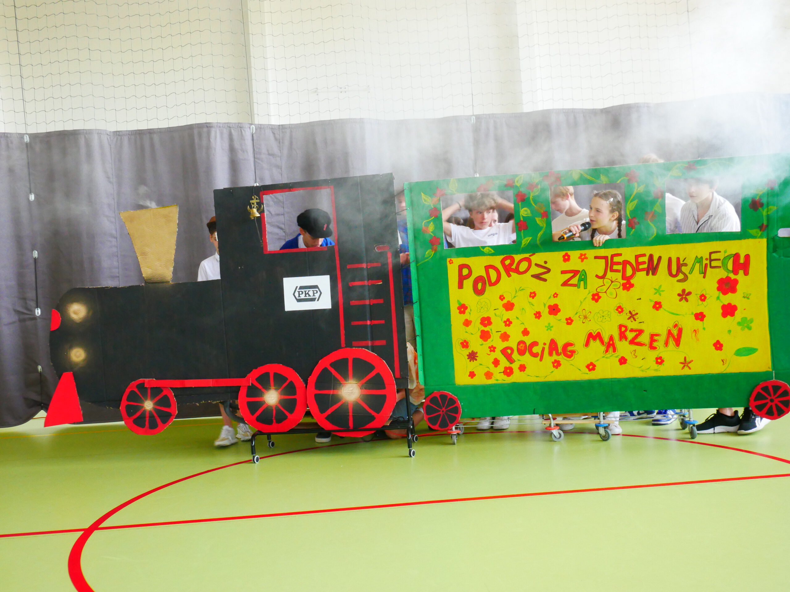 W dniu 21.06.2024 zakończył się rok szkolny. Uczniowie klas 7 razem z młodszymi koleżankami i kolegami przygotowali przedstawienie, w którym pociąg za jeden uśmiech odwiedzał różne miejscowości turystyczne. Uroczystość uświetnił występ chóru szkolnego.