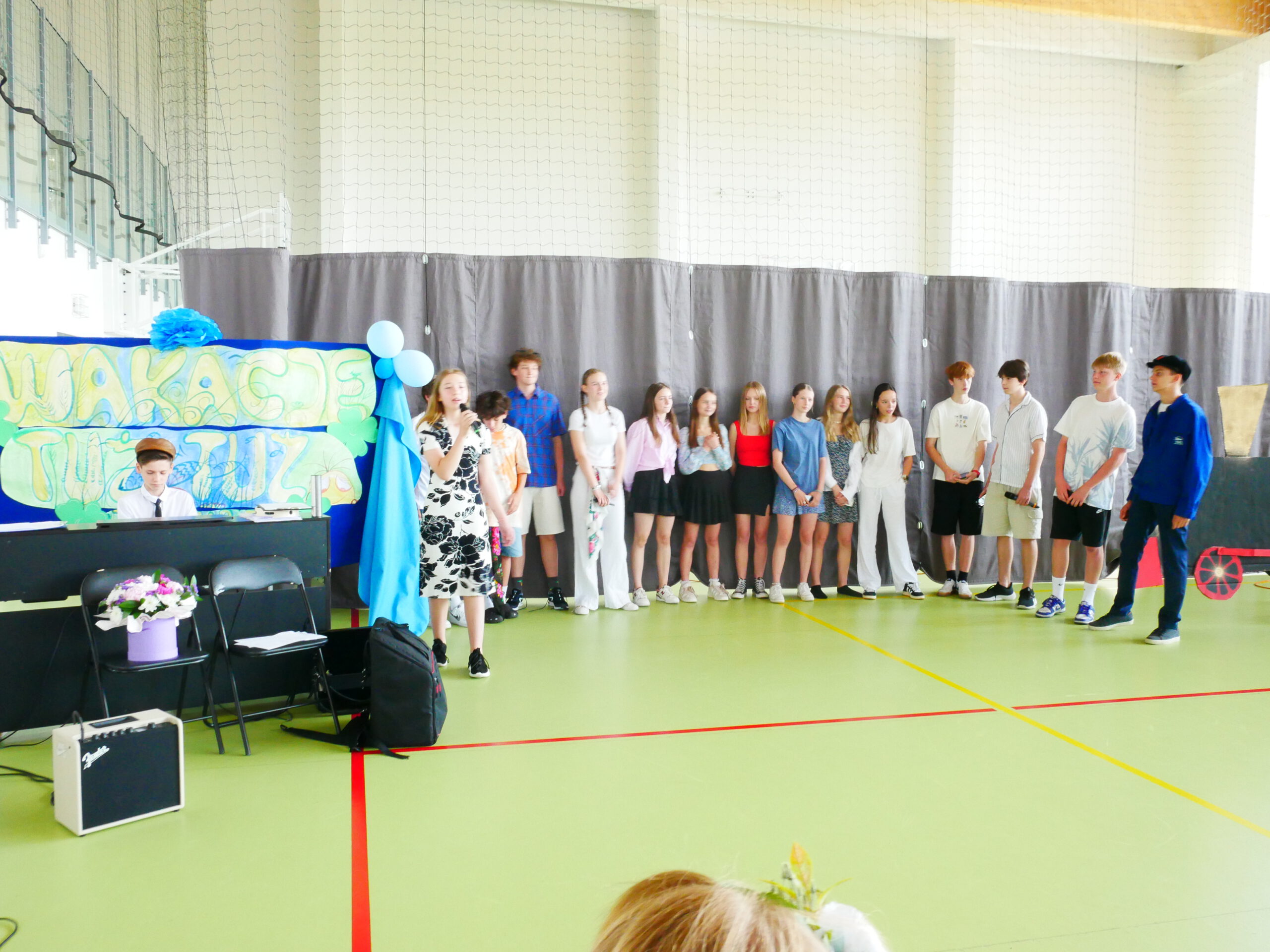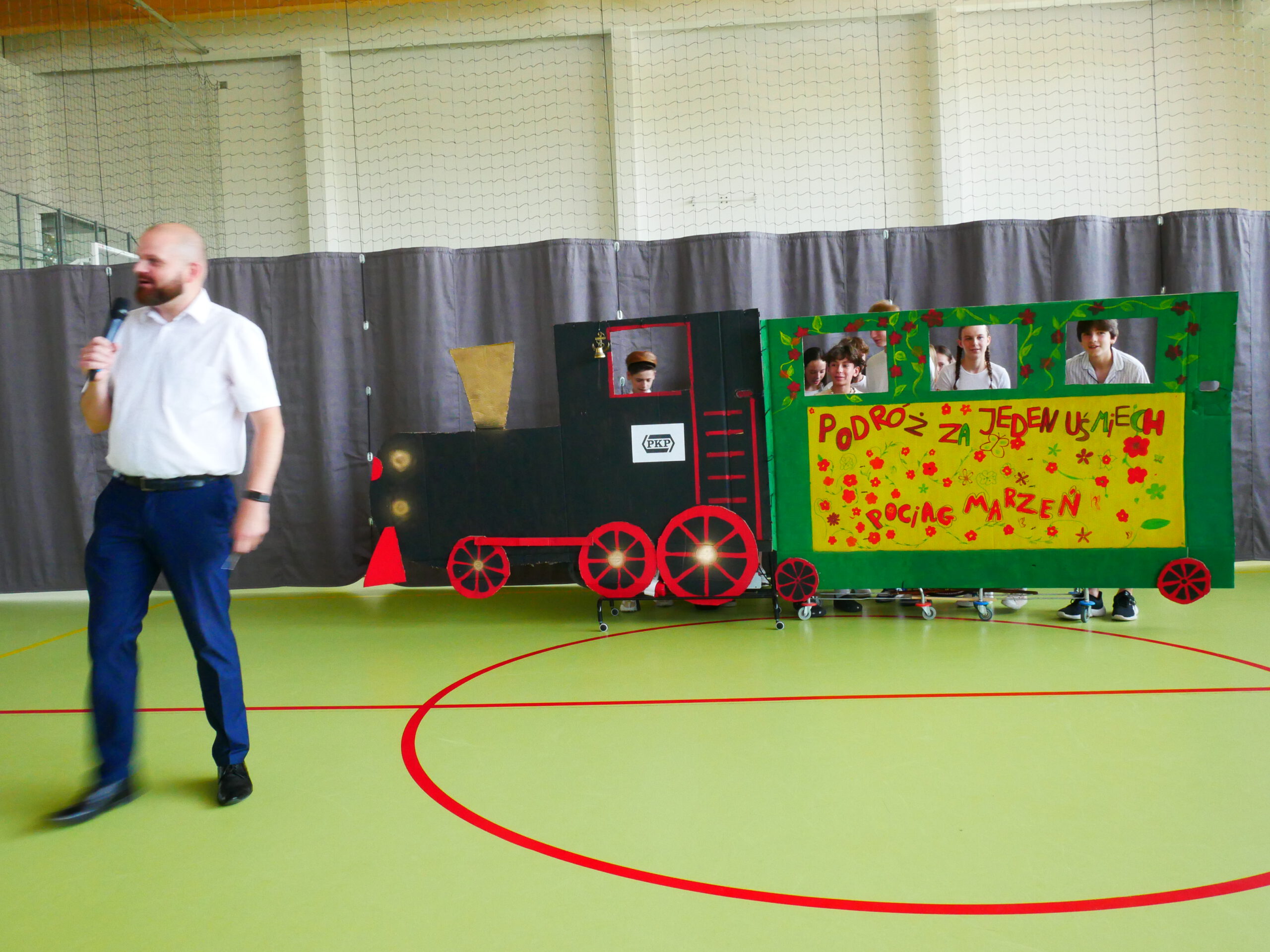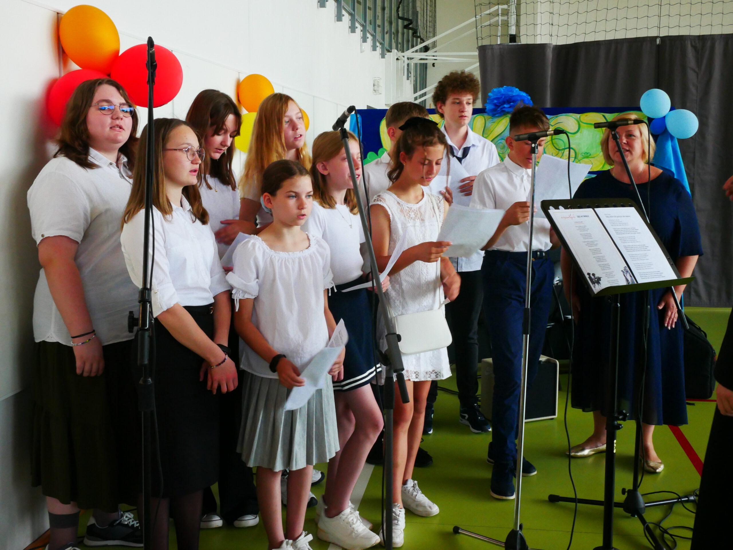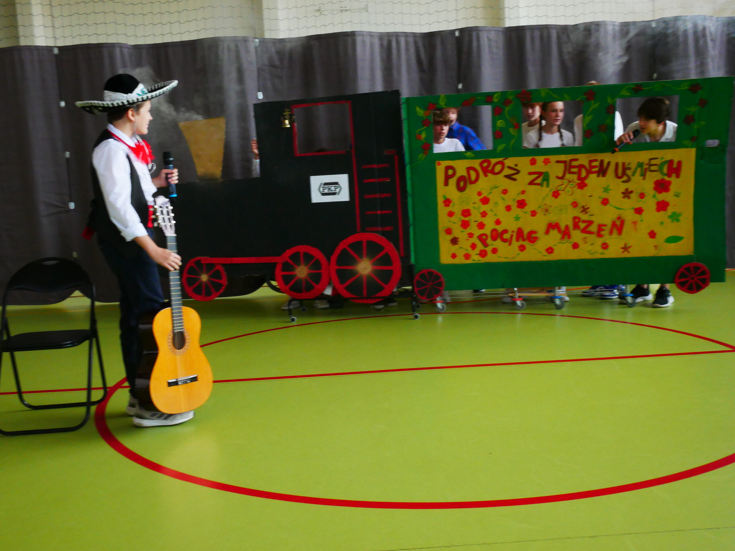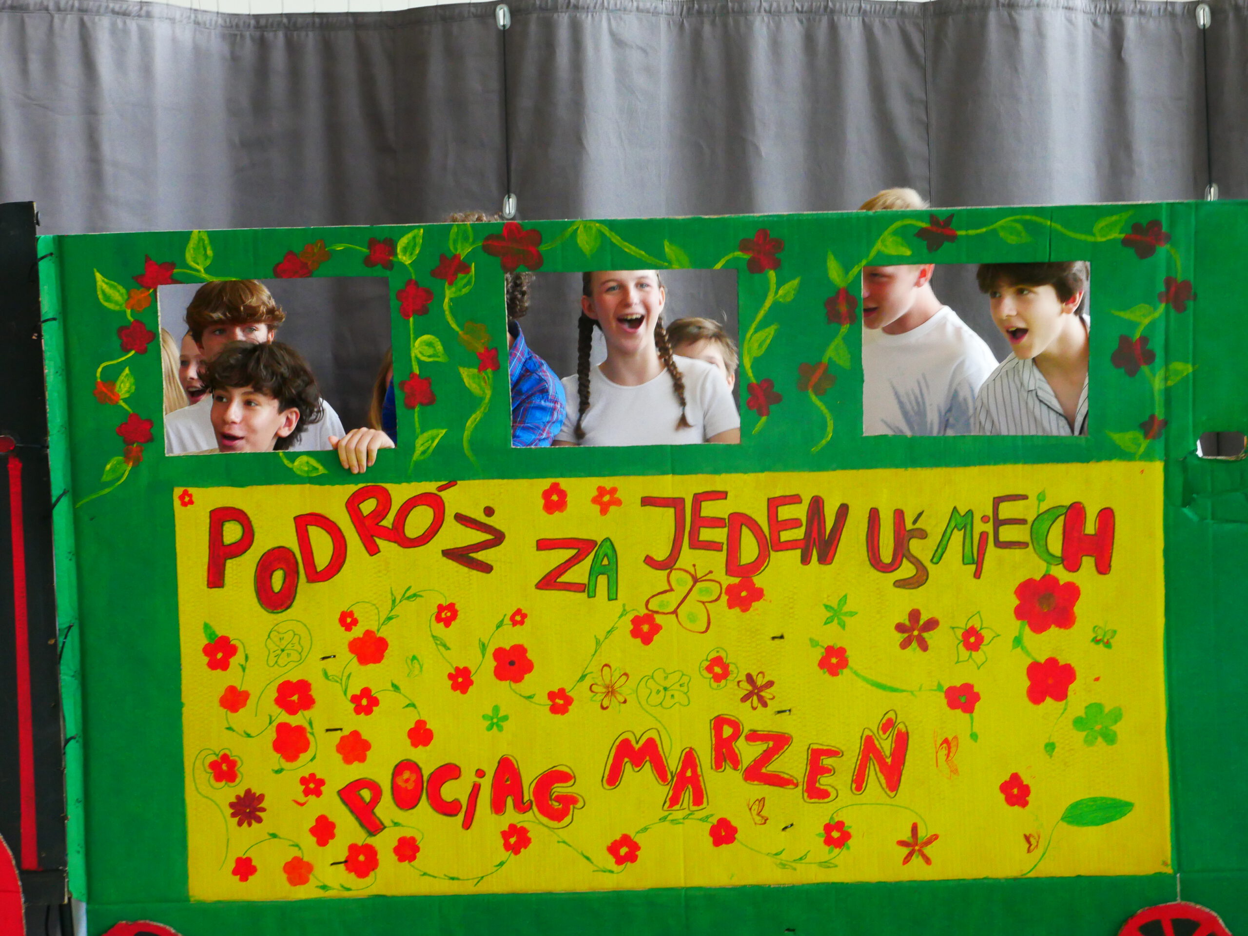 W dniu 21.06.2024 zakończył się rok szkolny. Uczniowie klas 7 razem z młodszymi koleżankami i kolegami przygotowali przedstawienie, w którym pociąg za jeden uśmiech odwiedzał różne miejscowości turystyczne. Uroczystość uświetnił występ chóru szkolnego.