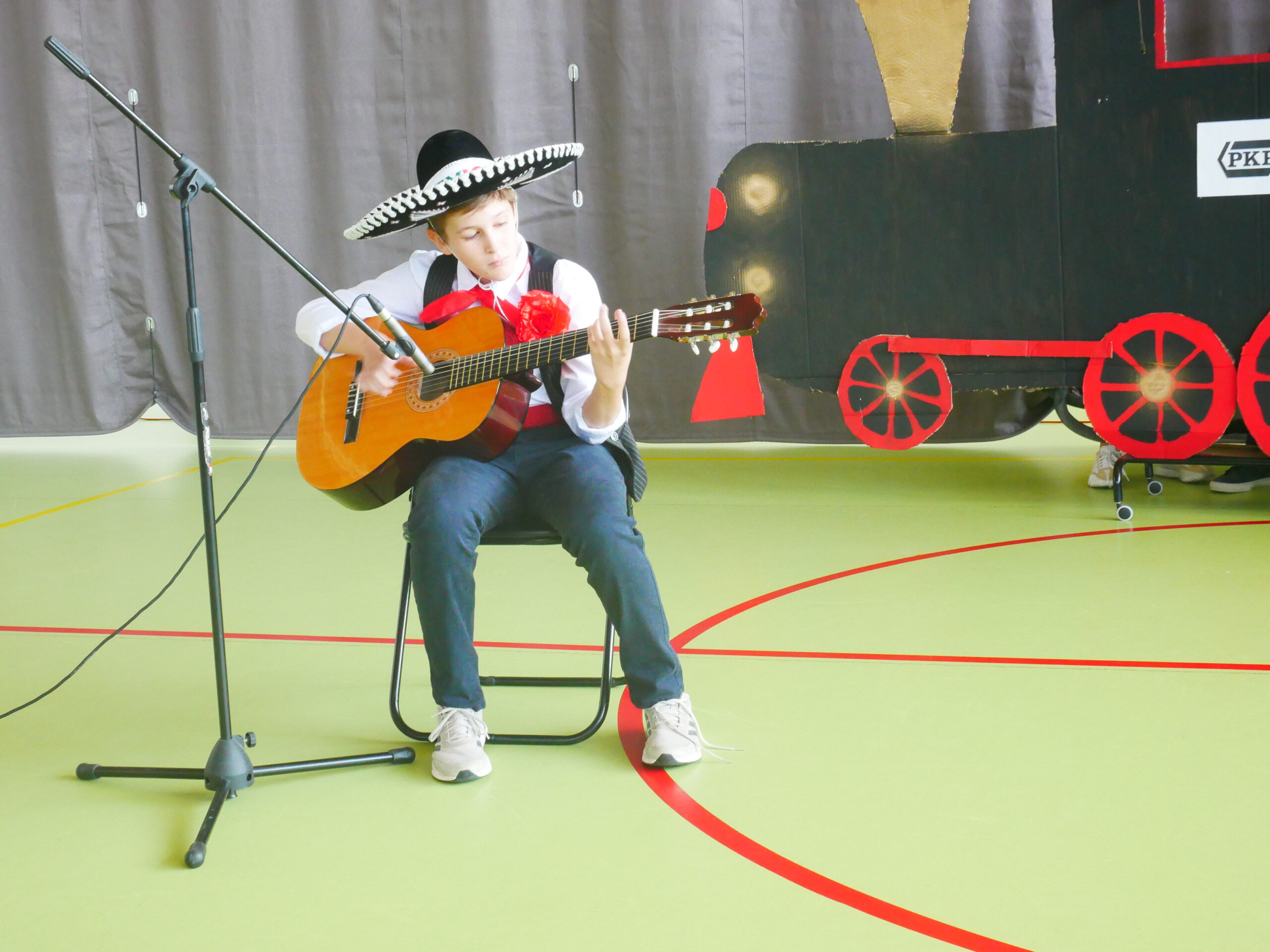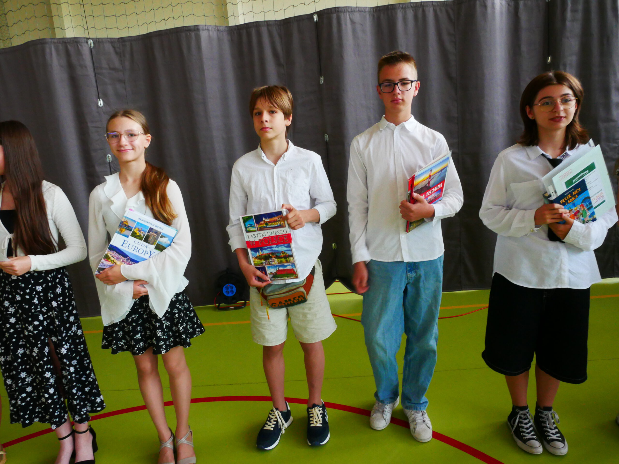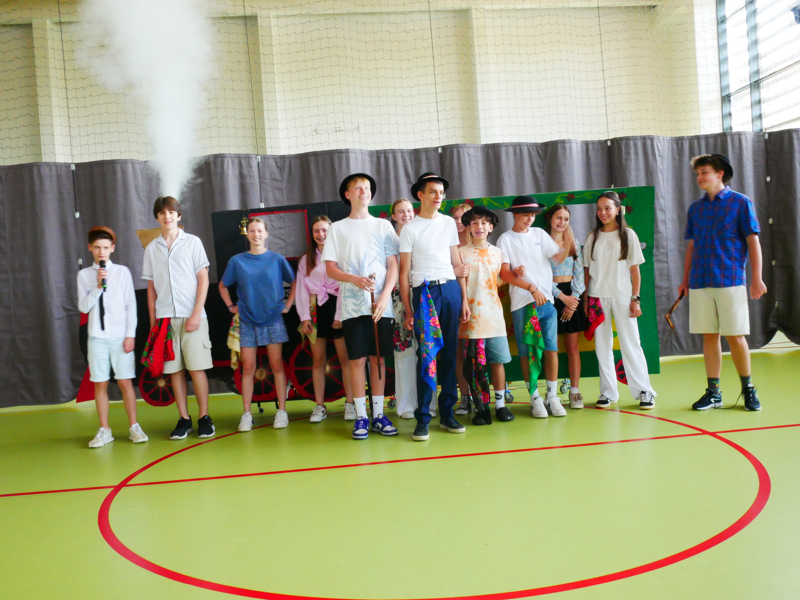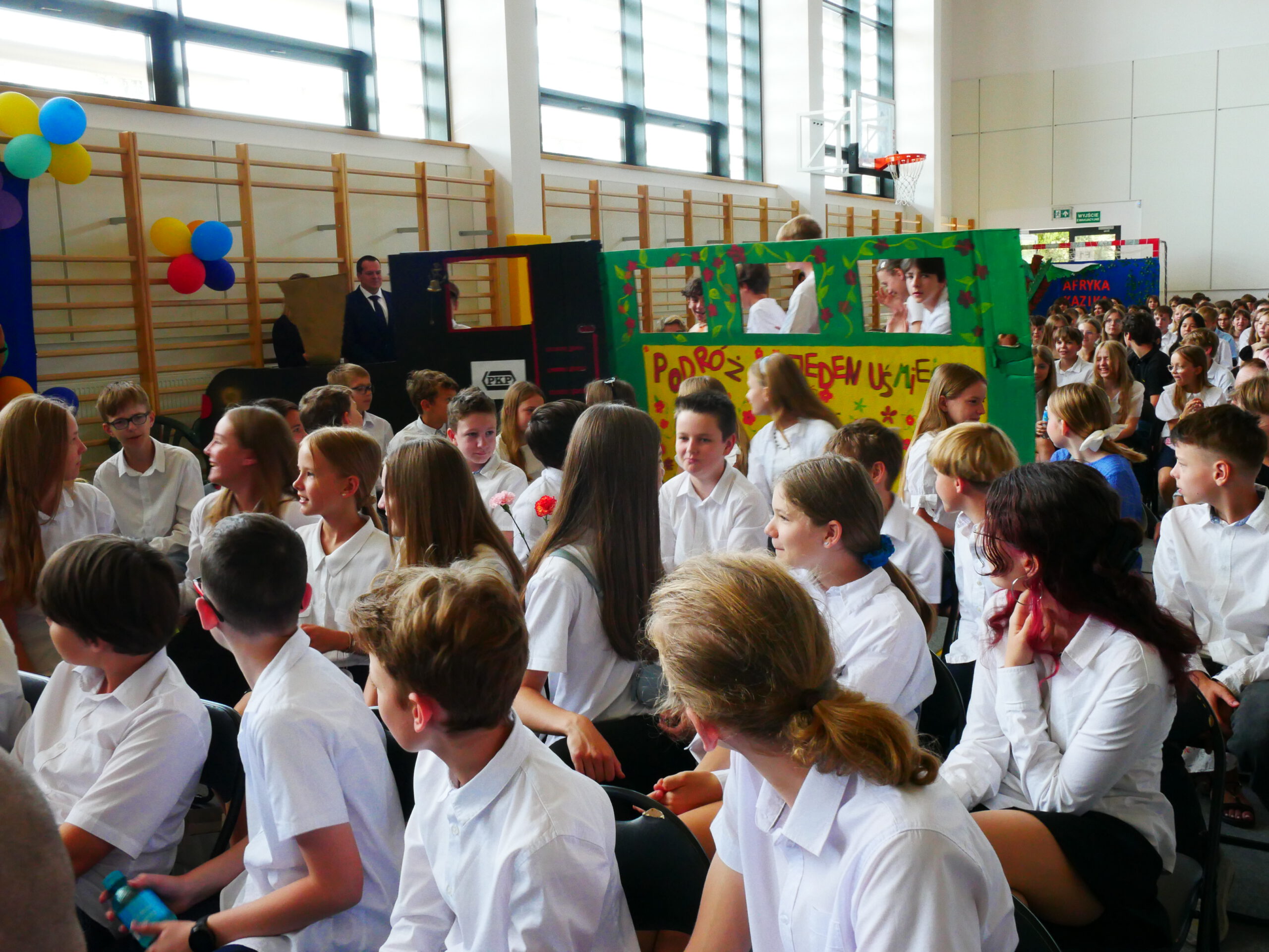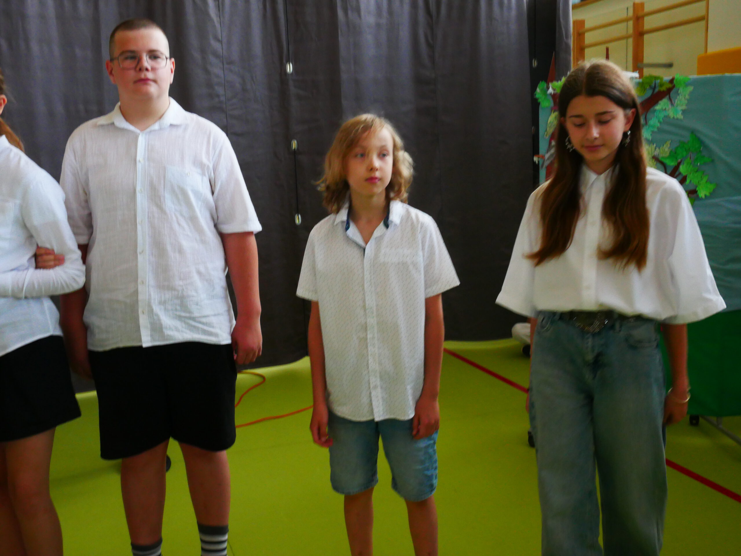 W dniu 21.06.2024 zakończył się rok szkolny. Uczniowie klas 7 razem z młodszymi koleżankami i kolegami przygotowali przedstawienie, w którym pociąg za jeden uśmiech odwiedzał różne miejscowości turystyczne. Uroczystość uświetnił występ chóru szkolnego.