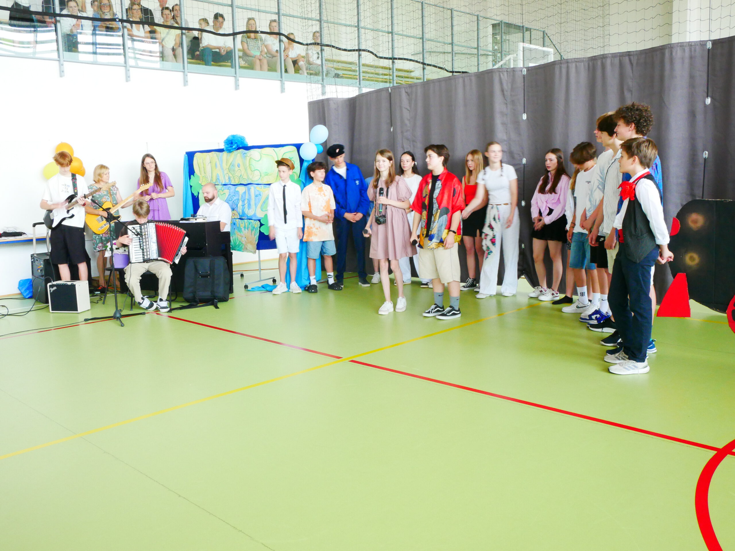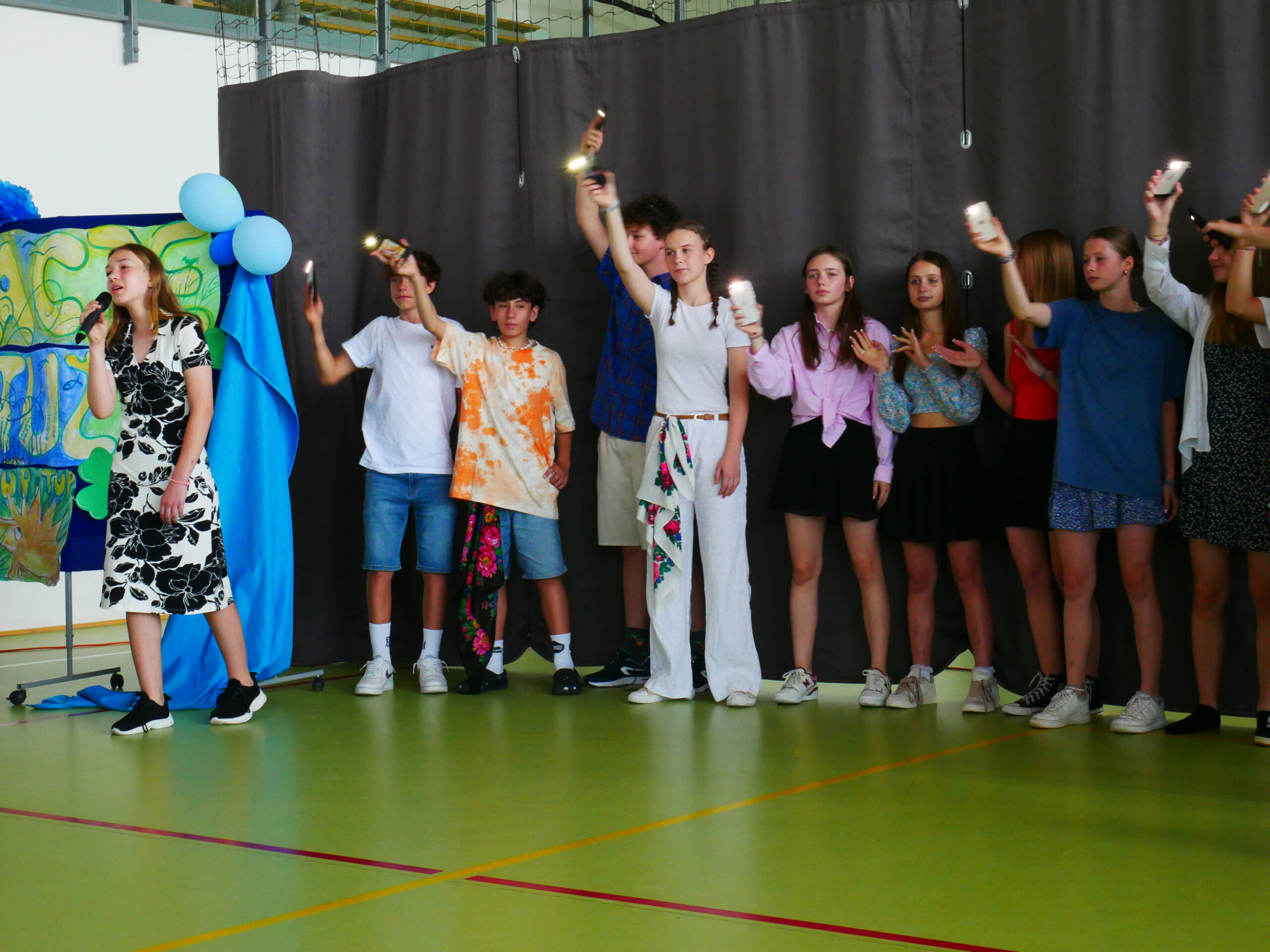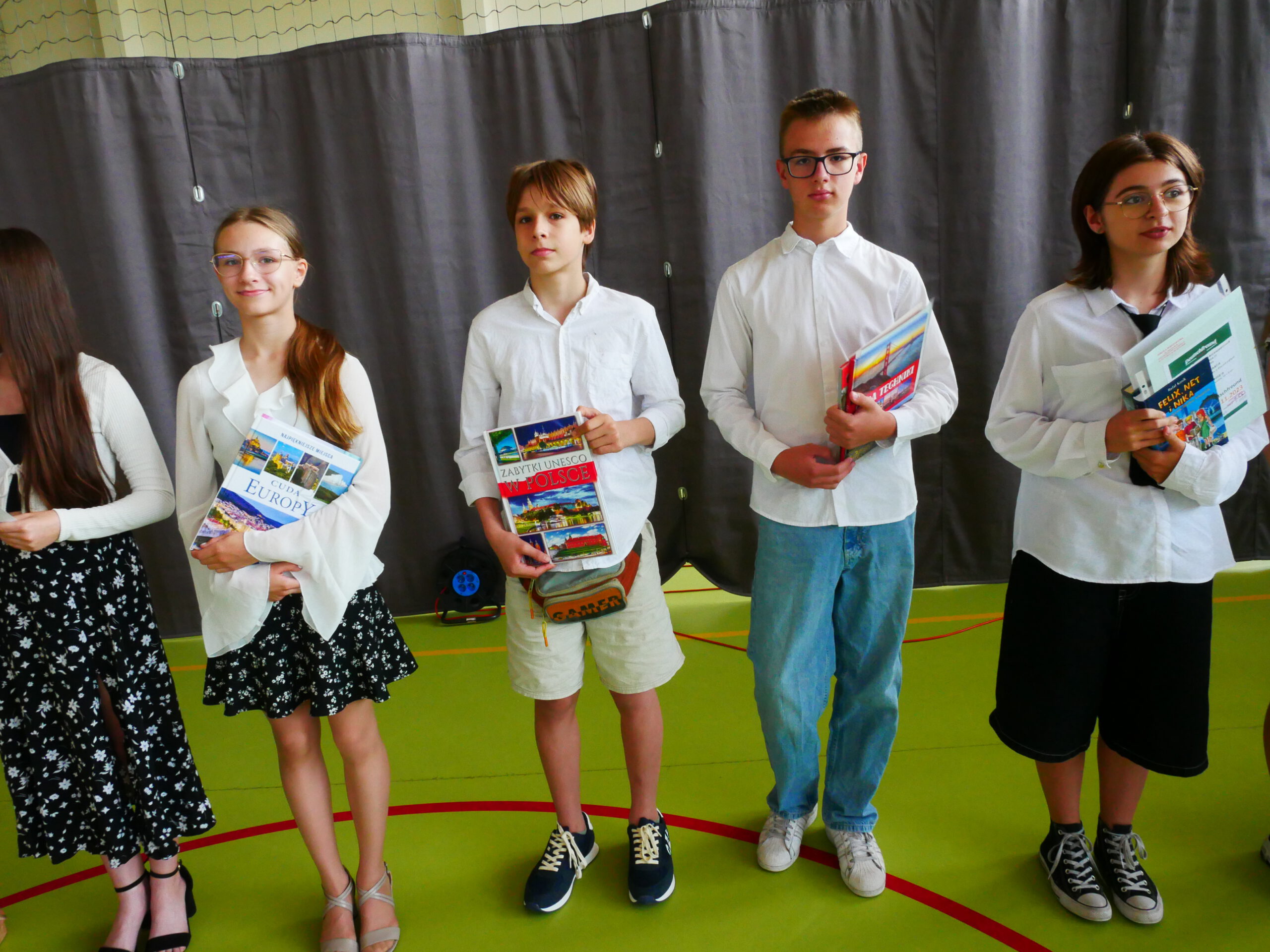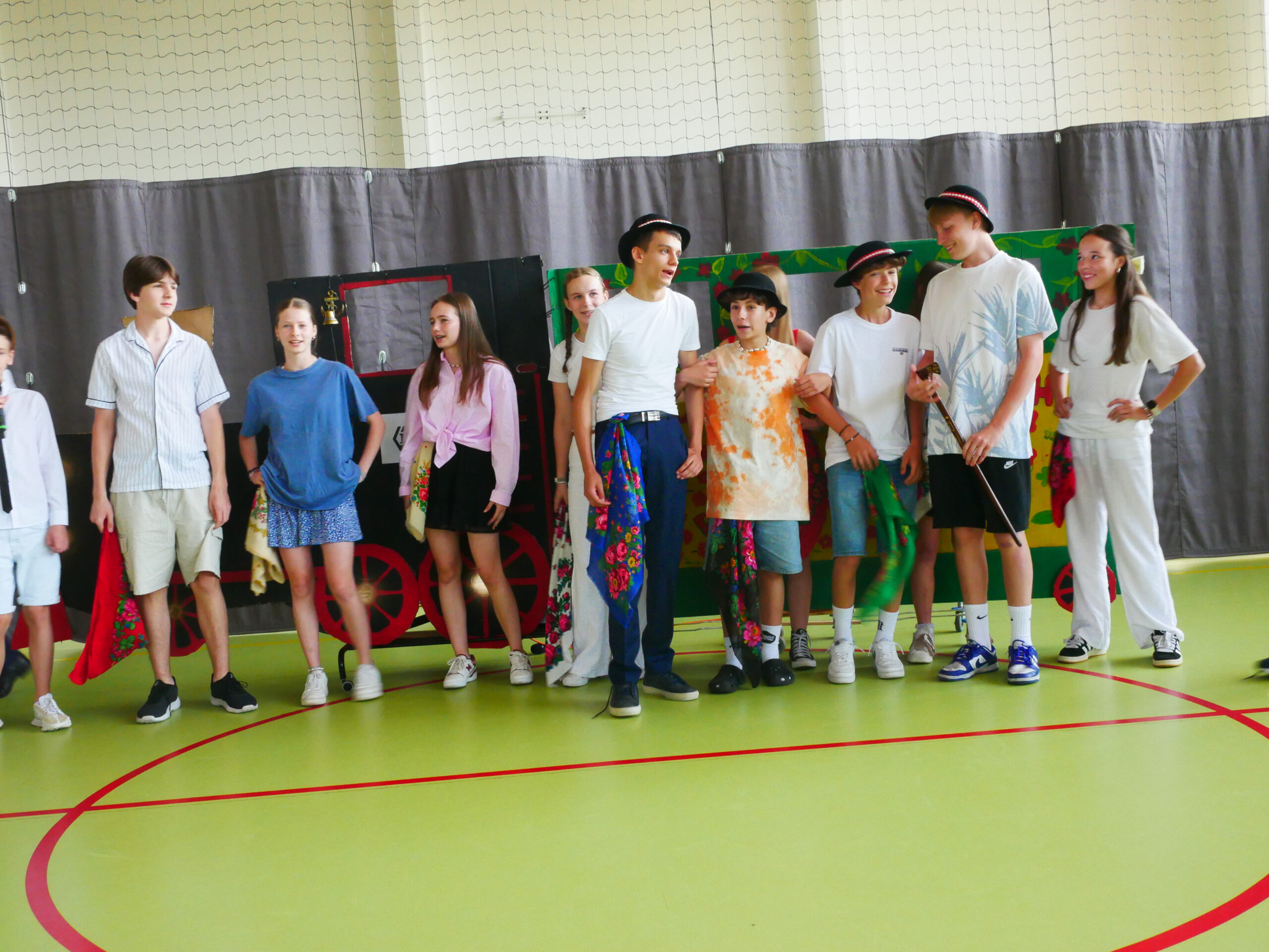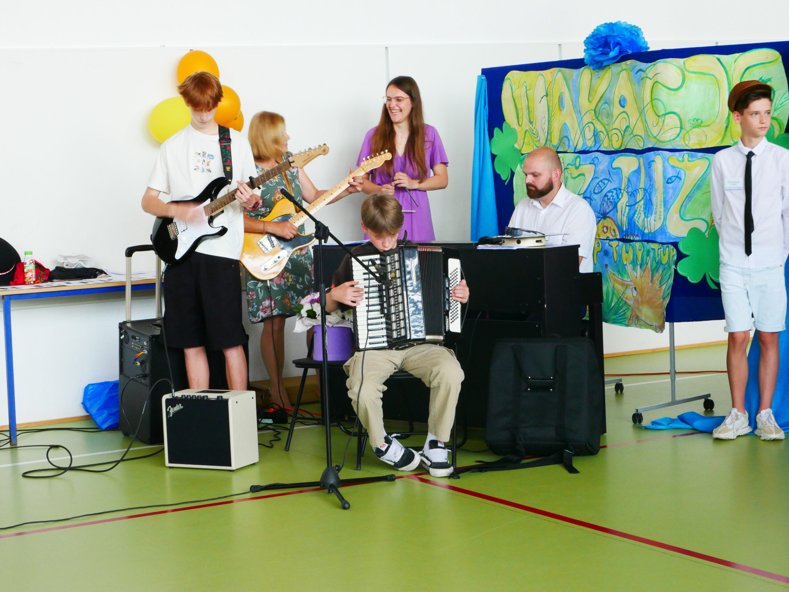 W dniu 21.06.2024 zakończył się rok szkolny. Uczniowie klas 7 razem z młodszymi koleżankami i kolegami przygotowali przedstawienie, w którym pociąg za jeden uśmiech odwiedzał różne miejscowości turystyczne. Uroczystość uświetnił występ chóru szkolnego.