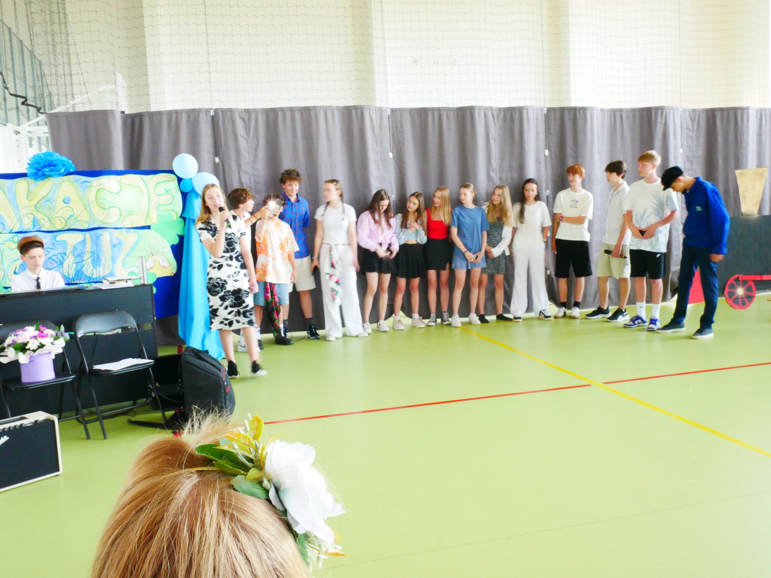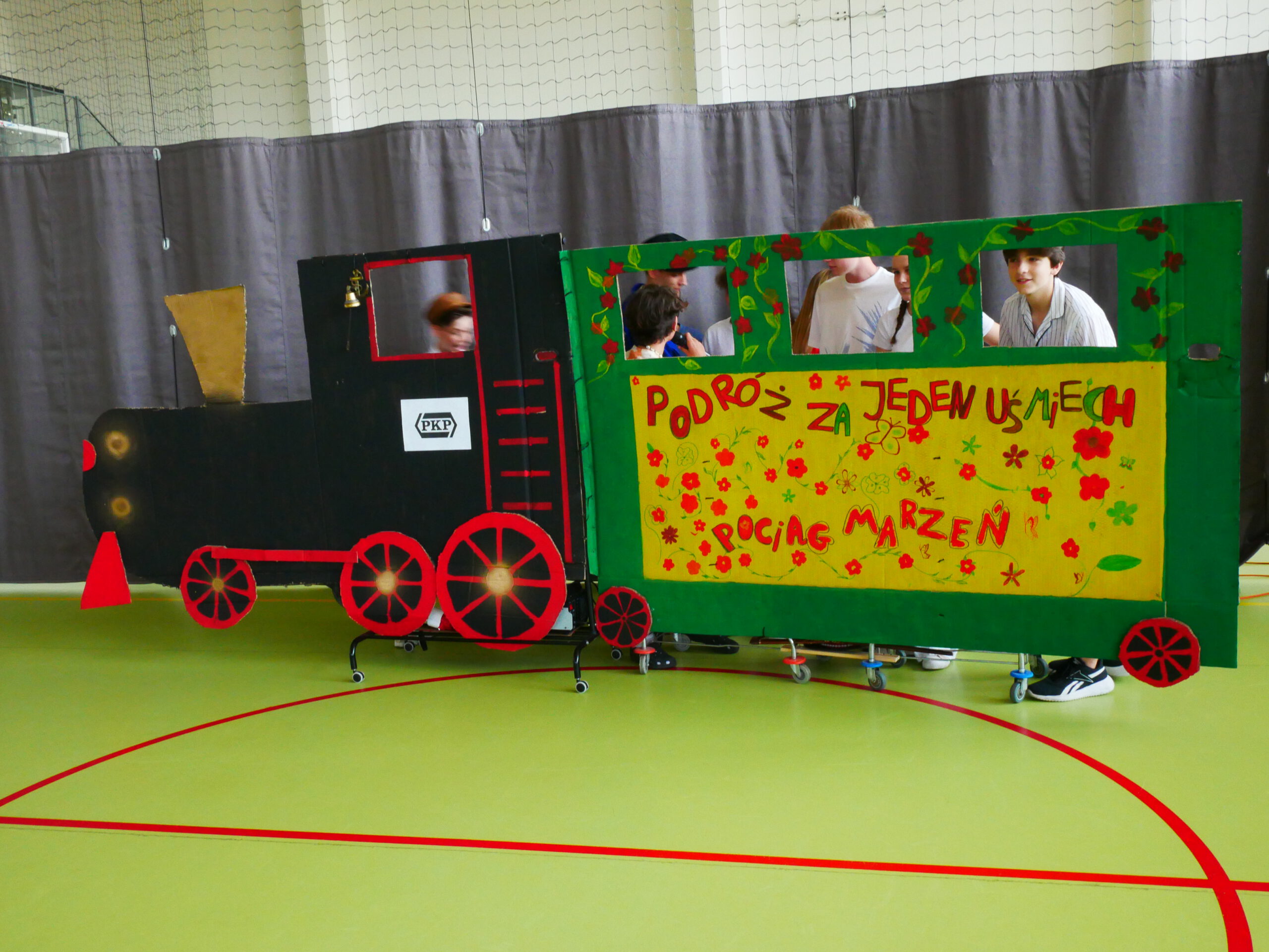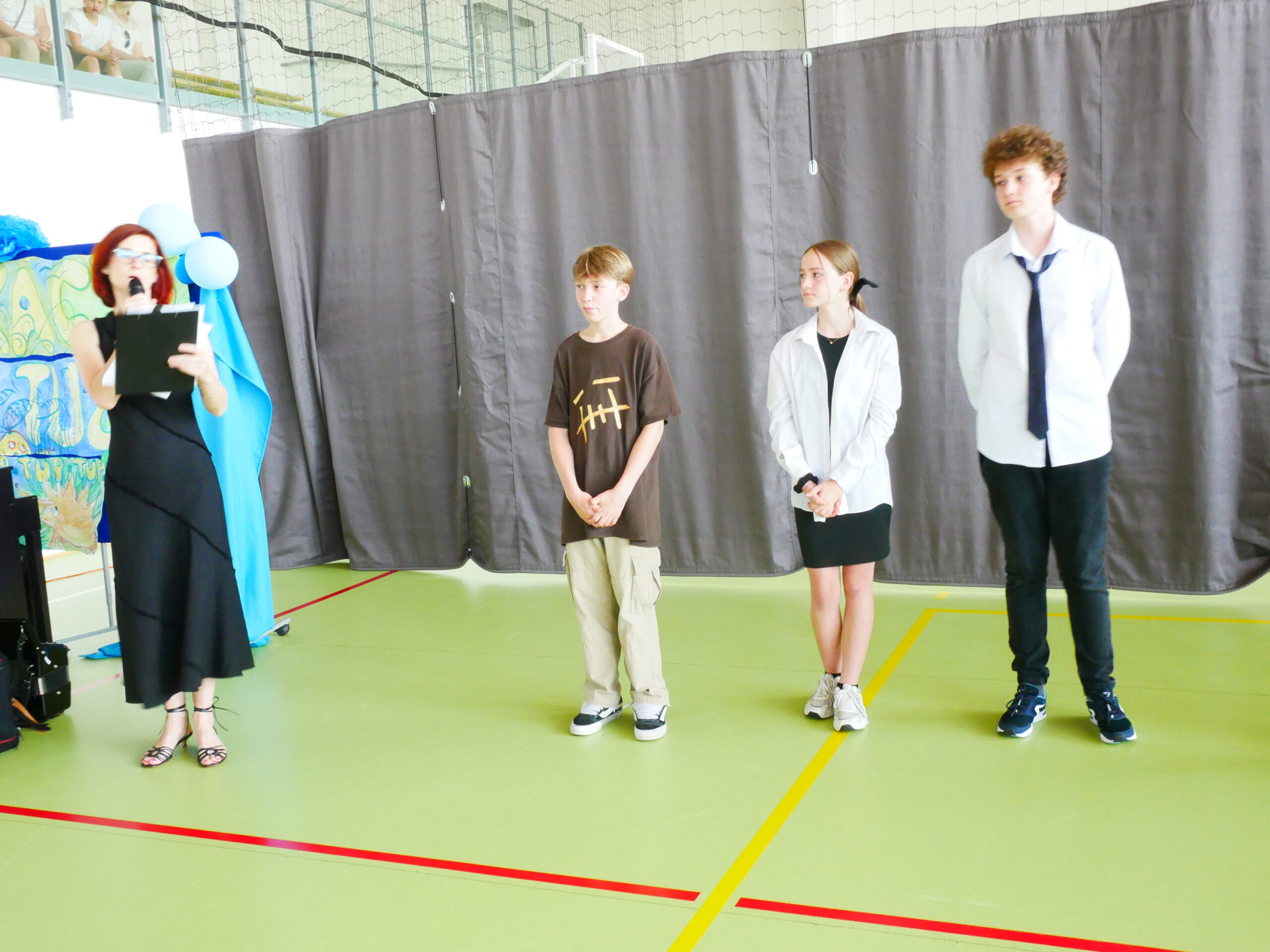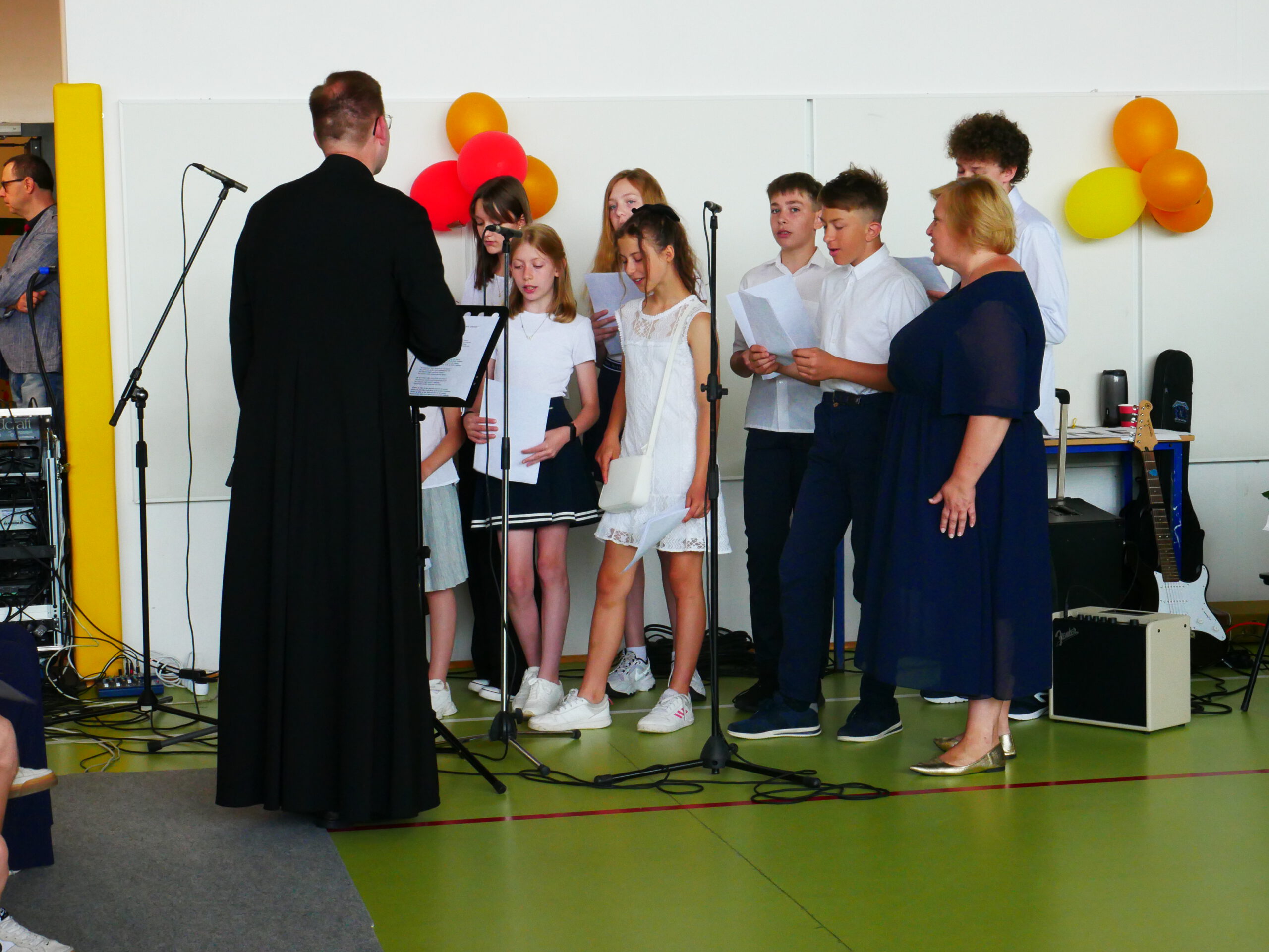 W dniu 21.06.2024 zakończył się rok szkolny. Uczniowie klas 7 razem z młodszymi koleżankami i kolegami przygotowali przedstawienie, w którym pociąg za jeden uśmiech odwiedzał różne miejscowości turystyczne. Uroczystość uświetnił występ chóru szkolnego.