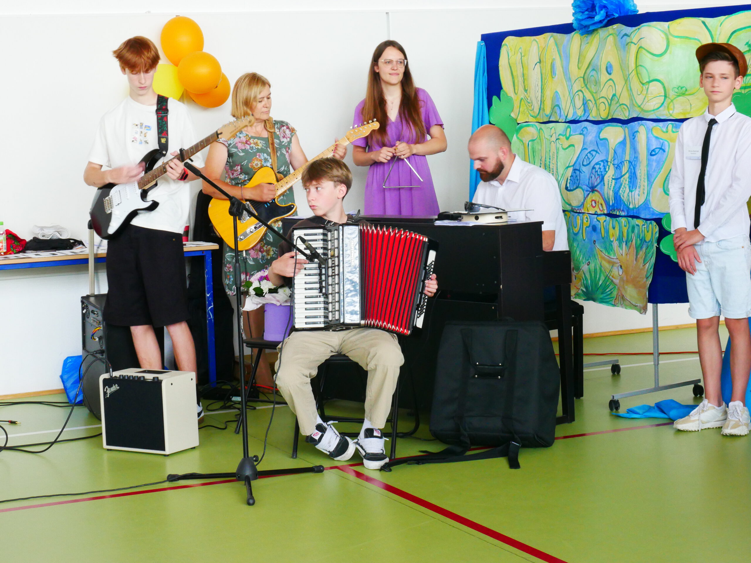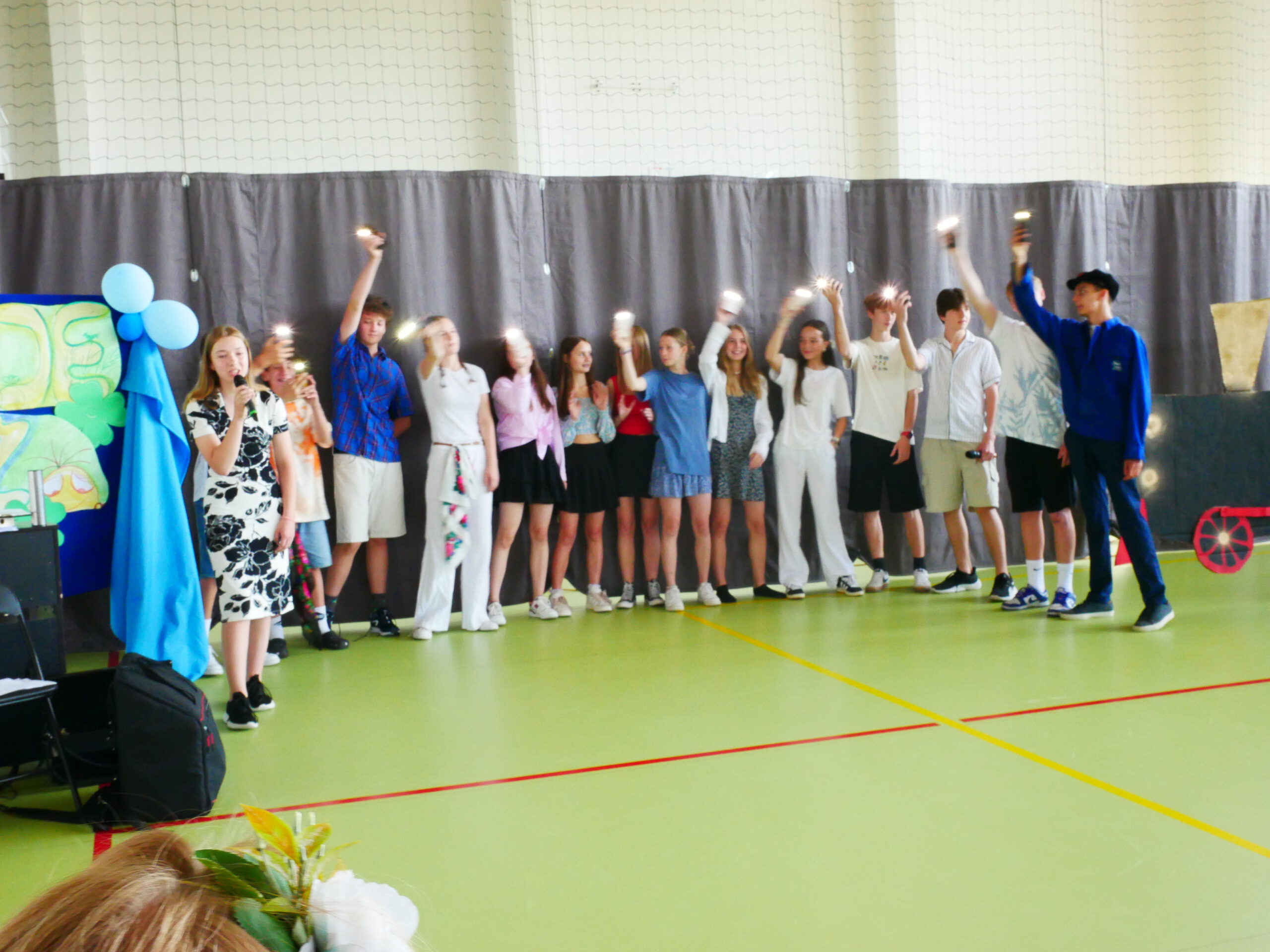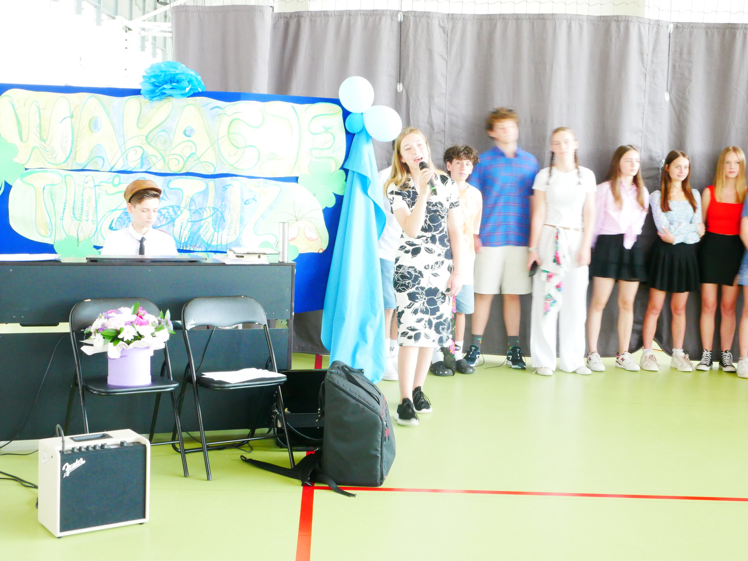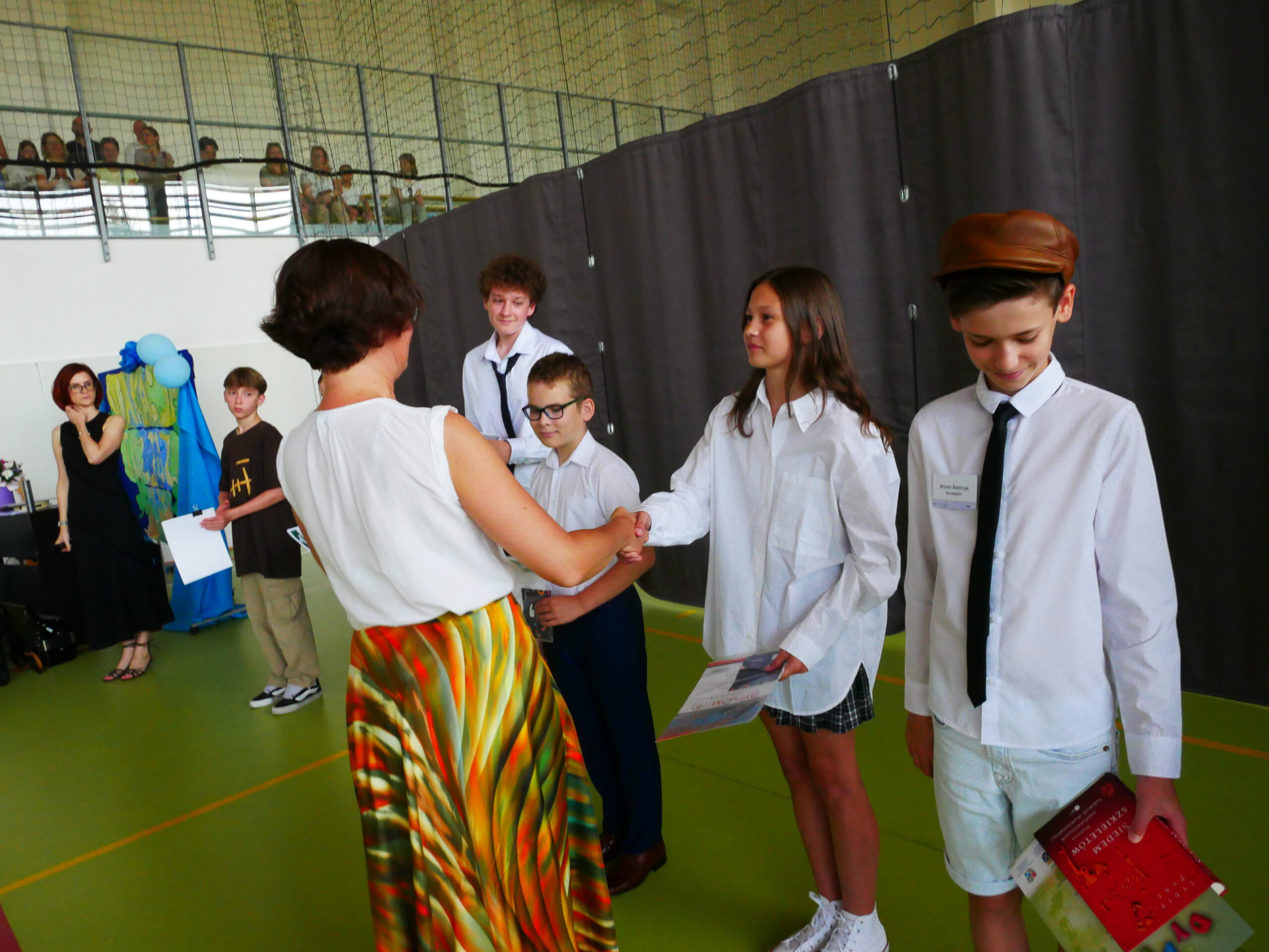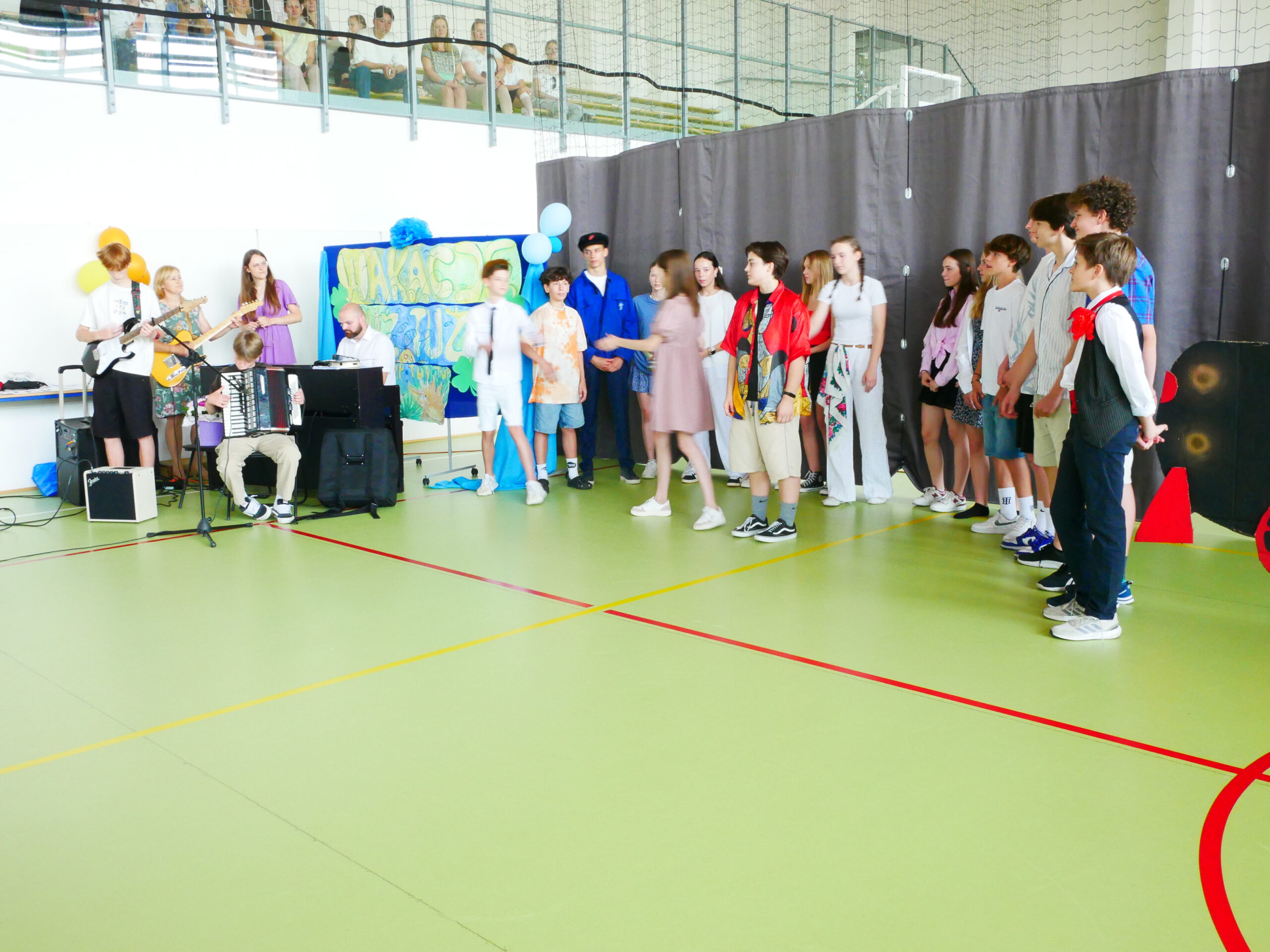 W dniu 21.06.2024 zakończył się rok szkolny. Uczniowie klas 7 razem z młodszymi koleżankami i kolegami przygotowali przedstawienie, w którym pociąg za jeden uśmiech odwiedzał różne miejscowości turystyczne. Uroczystość uświetnił występ chóru szkolnego.