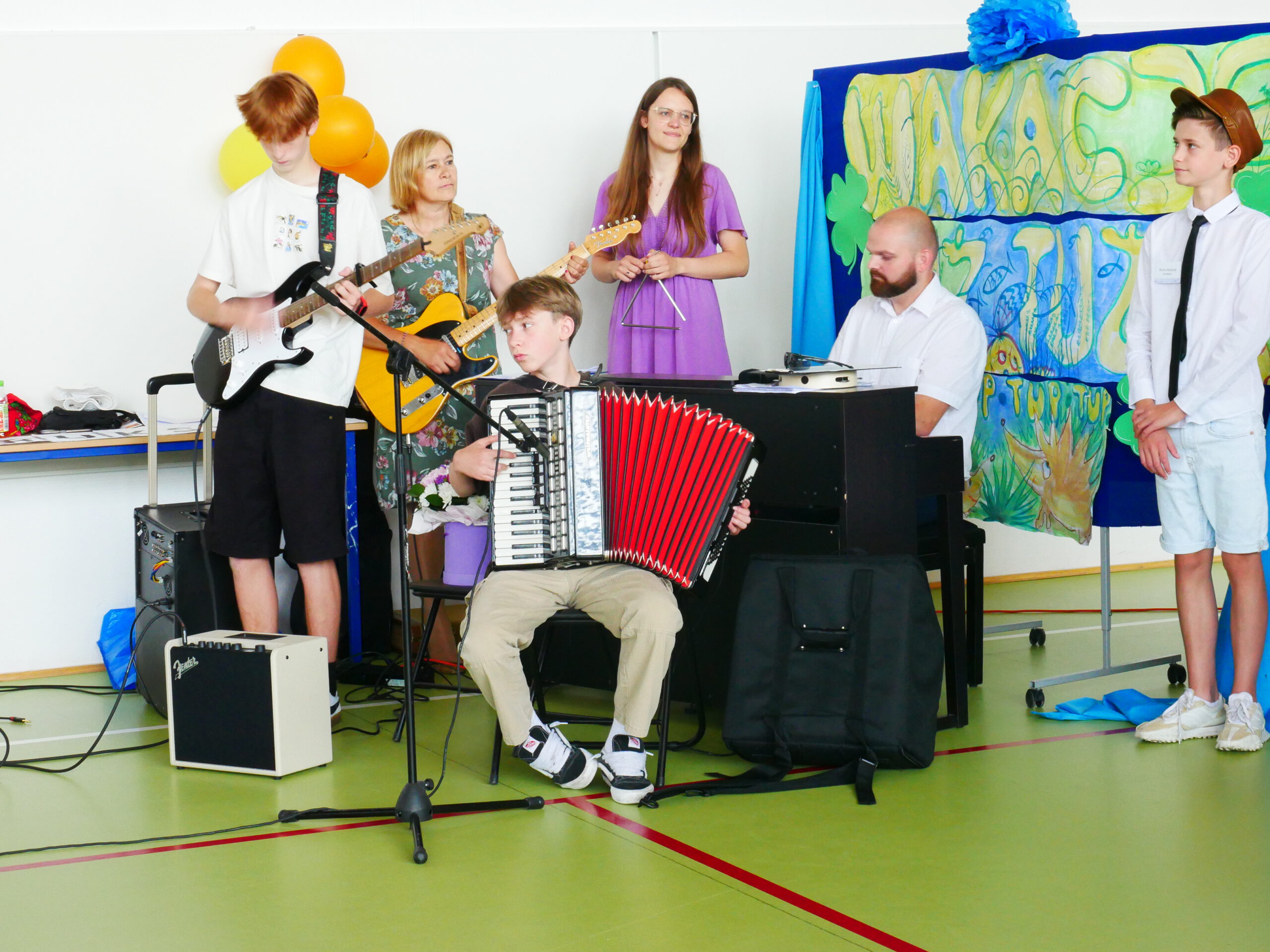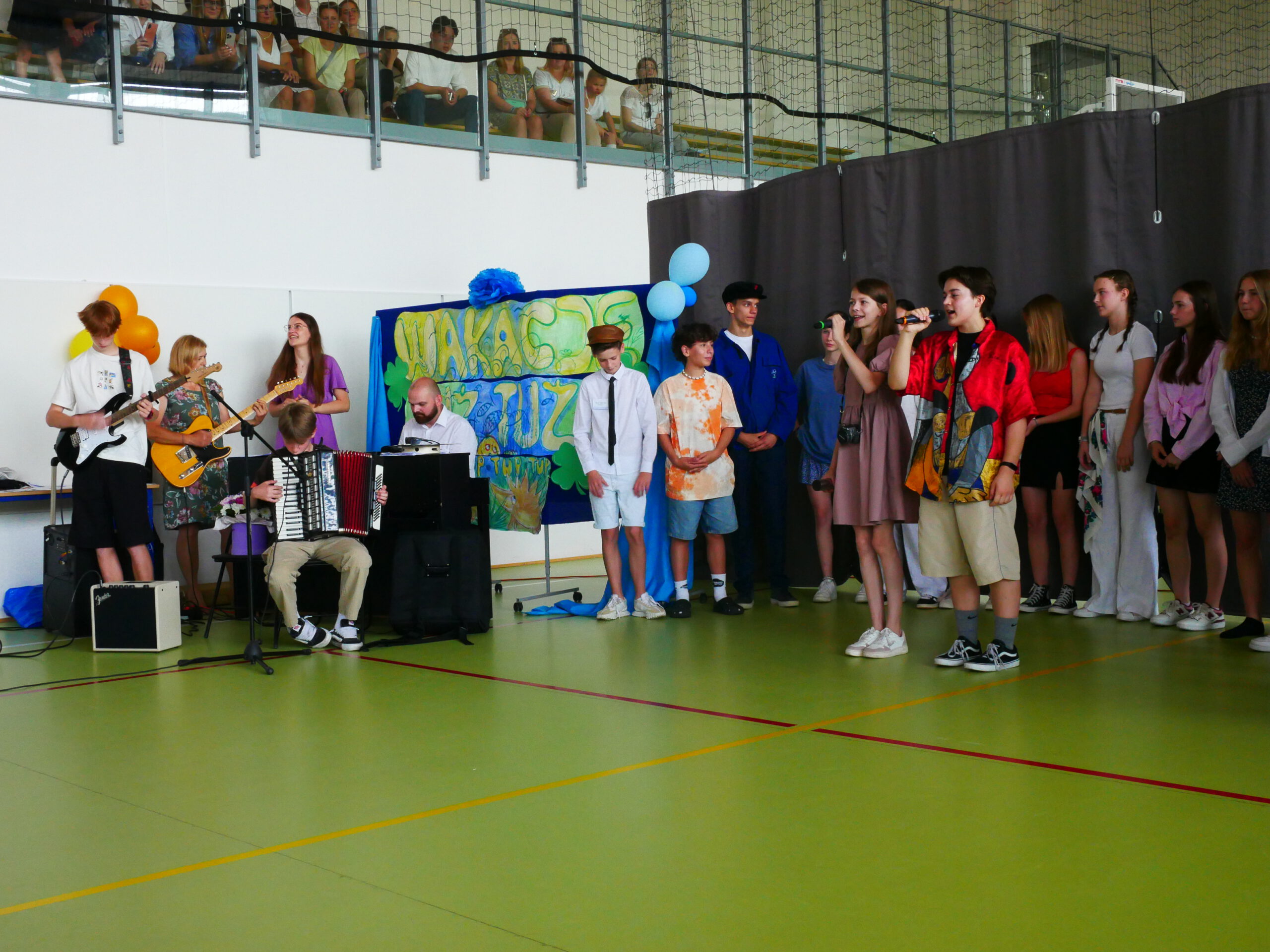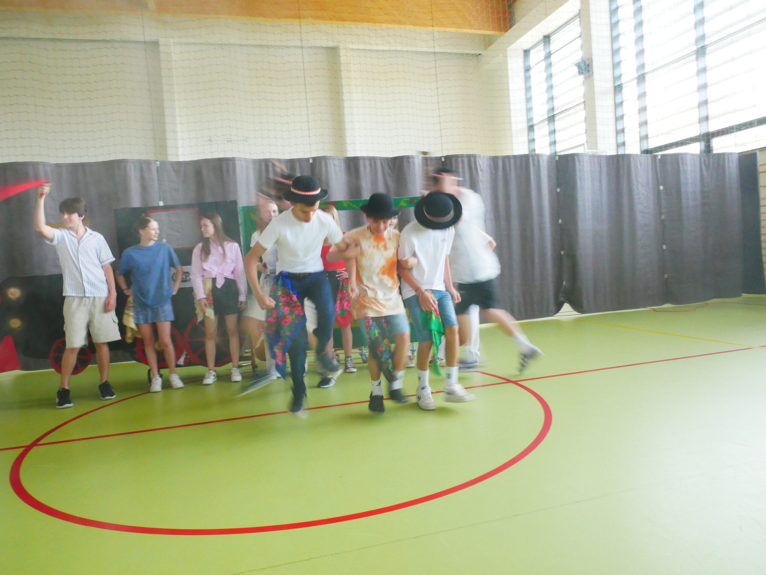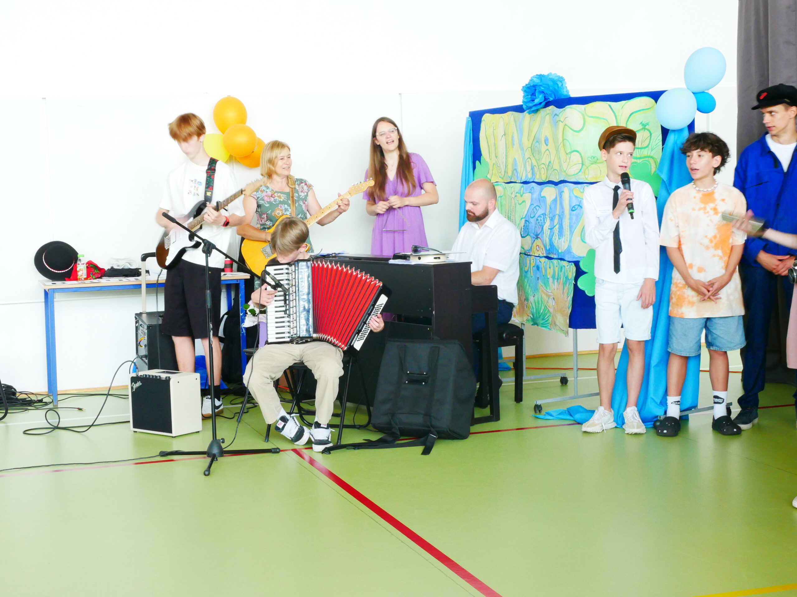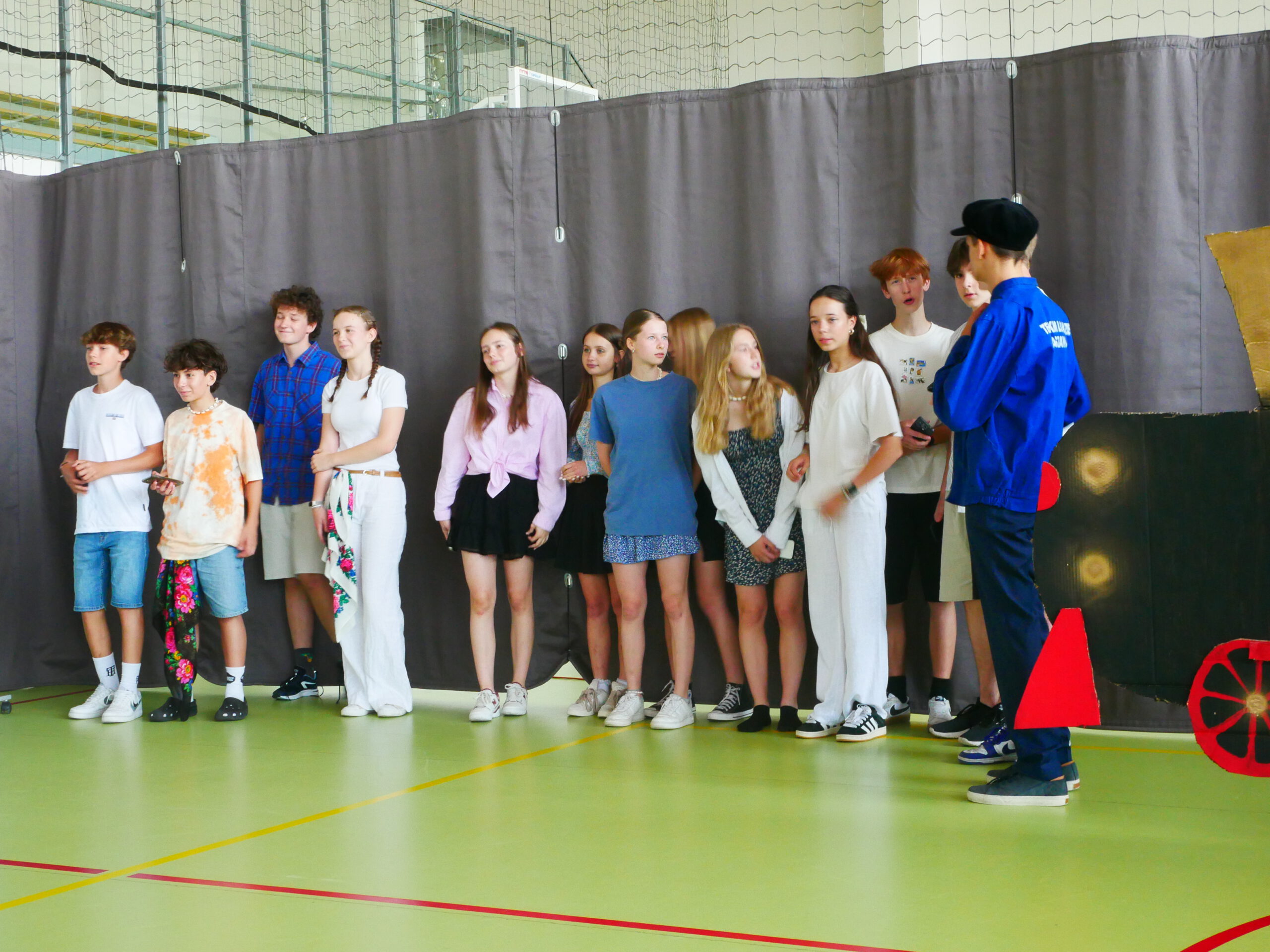 W dniu 21.06.2024 zakończył się rok szkolny. Uczniowie klas 7 razem z młodszymi koleżankami i kolegami przygotowali przedstawienie, w którym pociąg za jeden uśmiech odwiedzał różne miejscowości turystyczne. Uroczystość uświetnił występ chóru szkolnego.