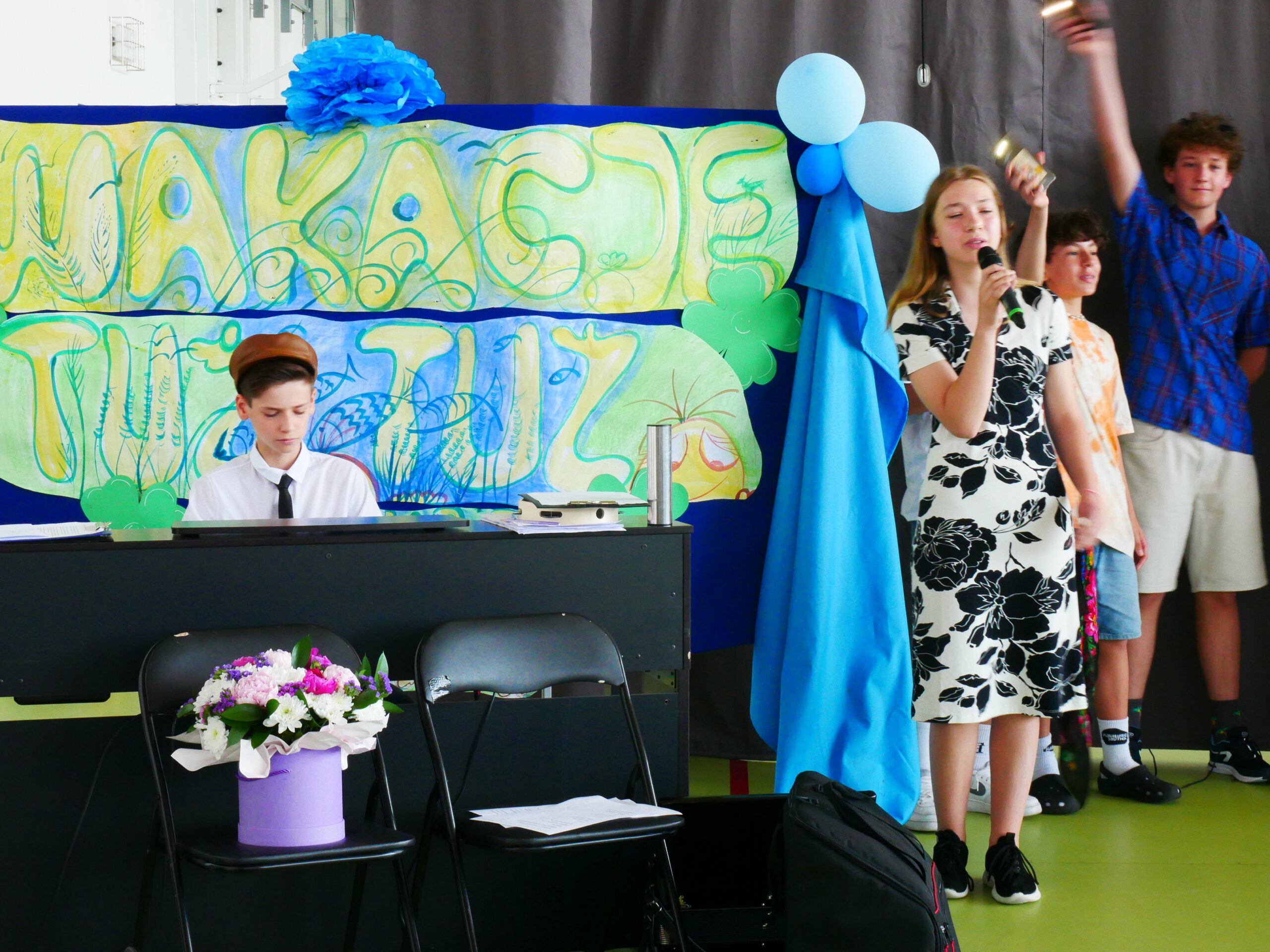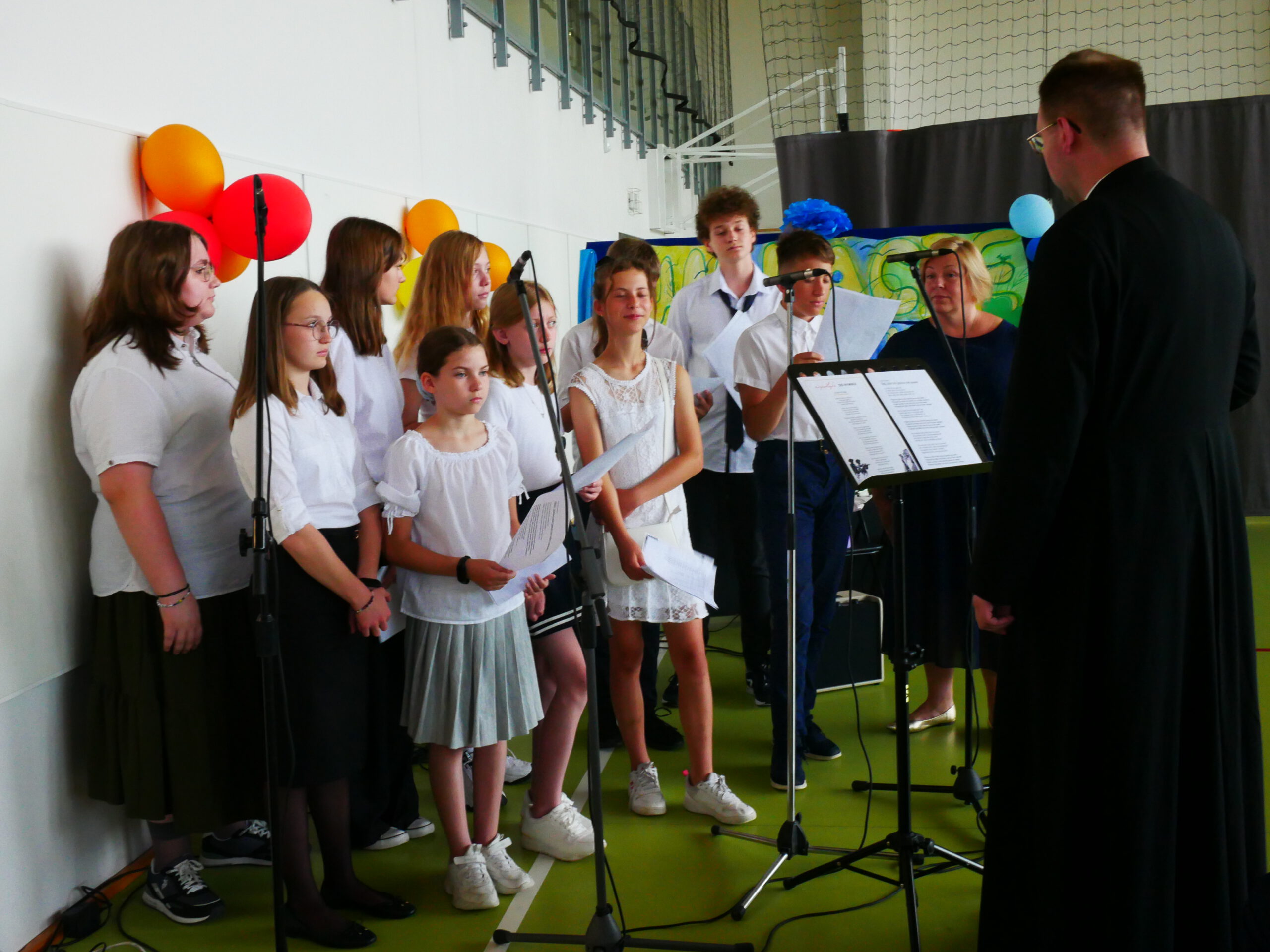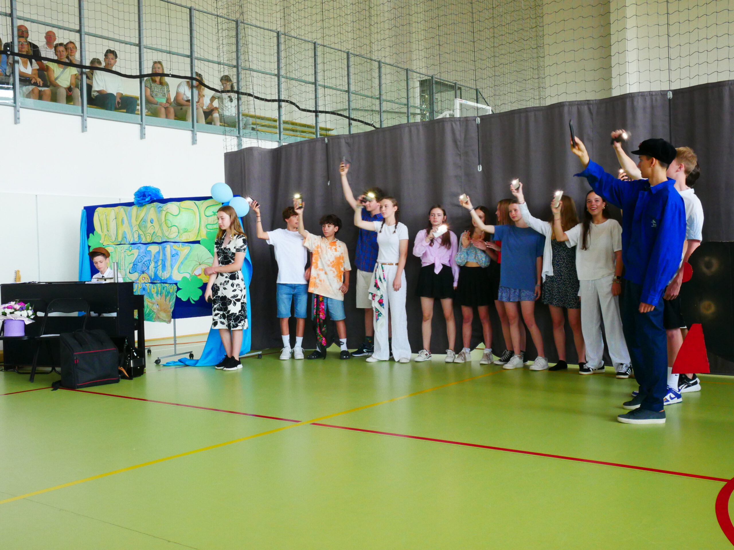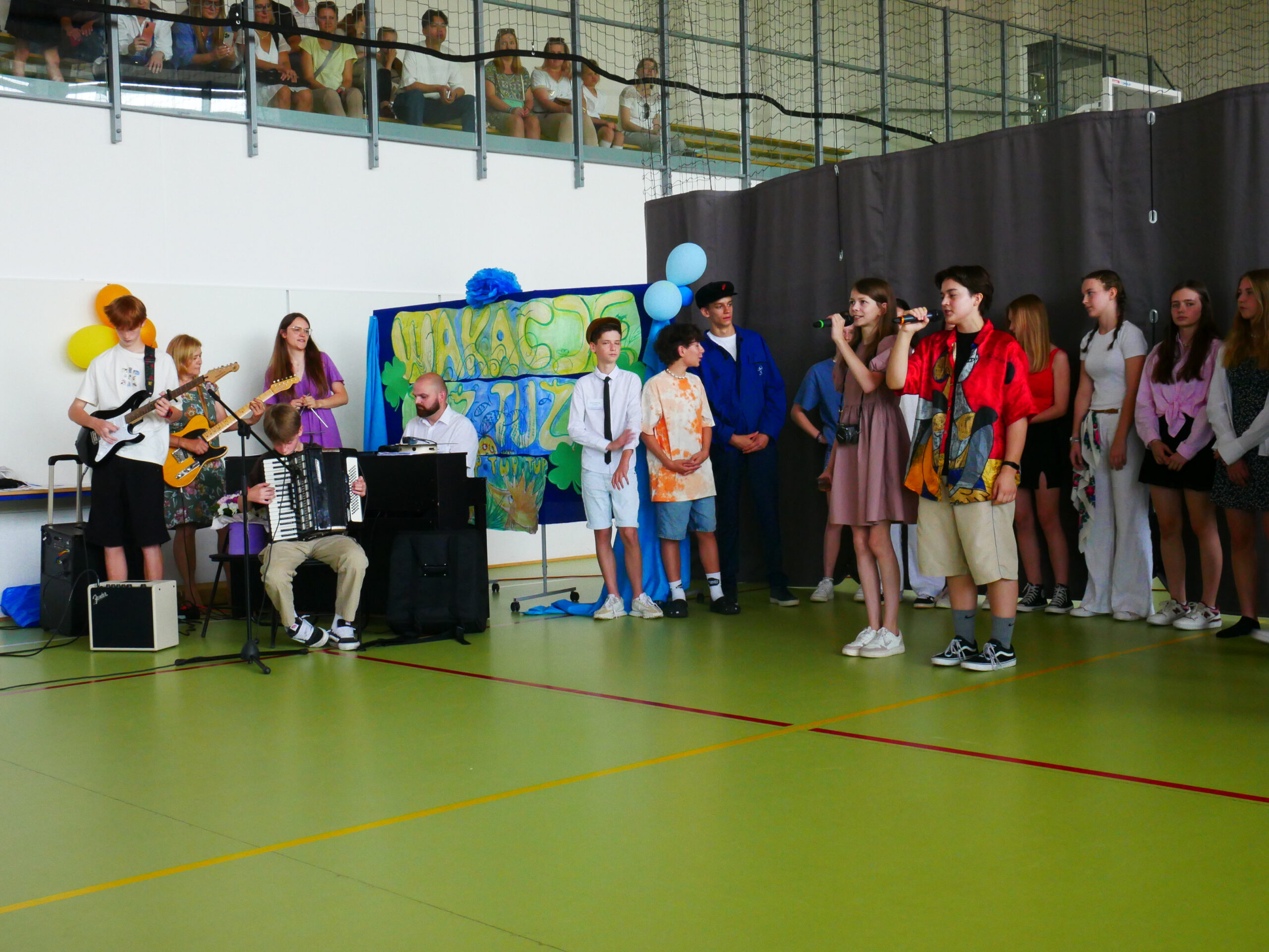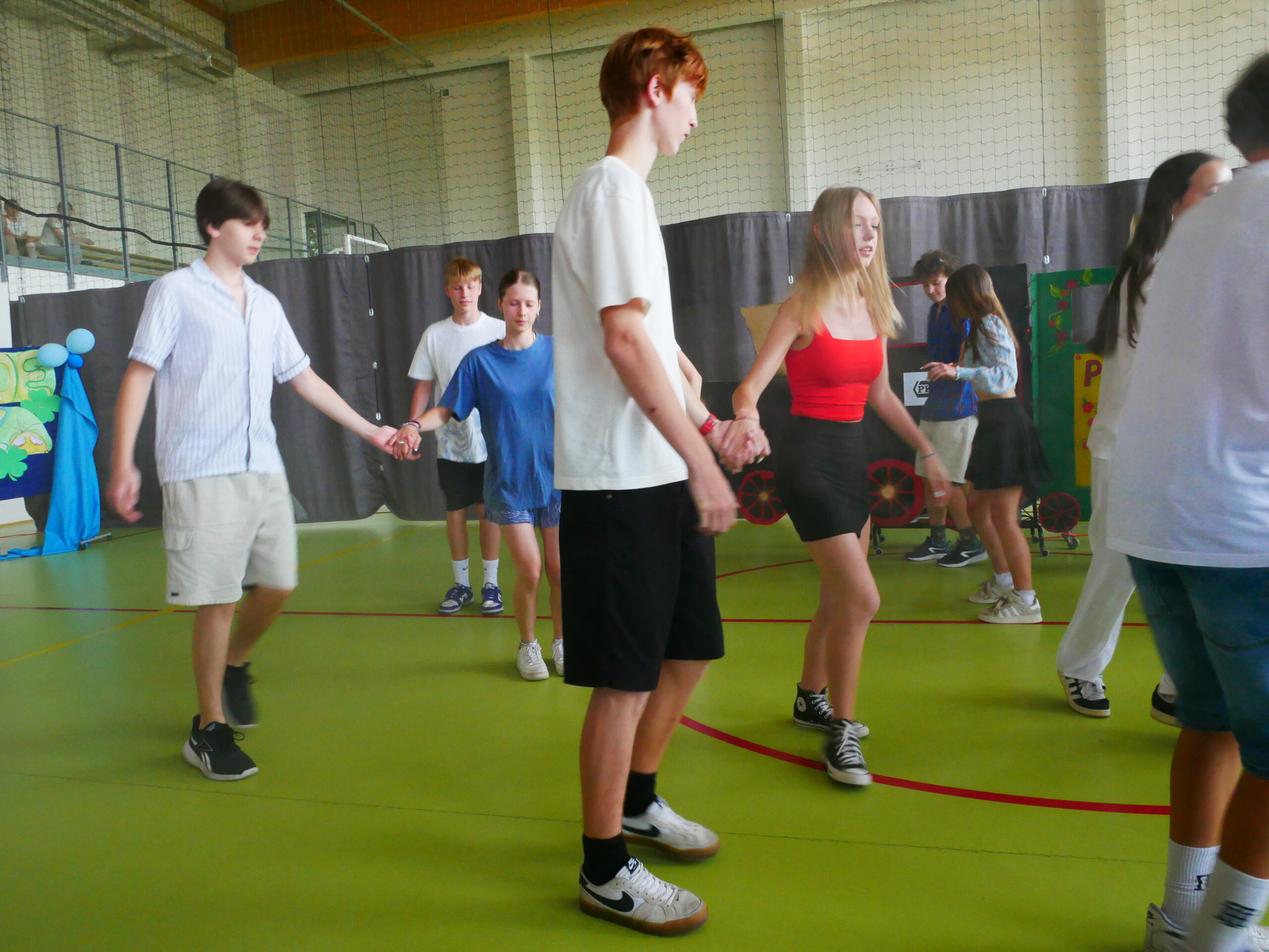 W dniu 21.06.2024 zakończył się rok szkolny. Uczniowie klas 7 razem z młodszymi koleżankami i kolegami przygotowali przedstawienie, w którym pociąg za jeden uśmiech odwiedzał różne miejscowości turystyczne. Uroczystość uświetnił występ chóru szkolnego.