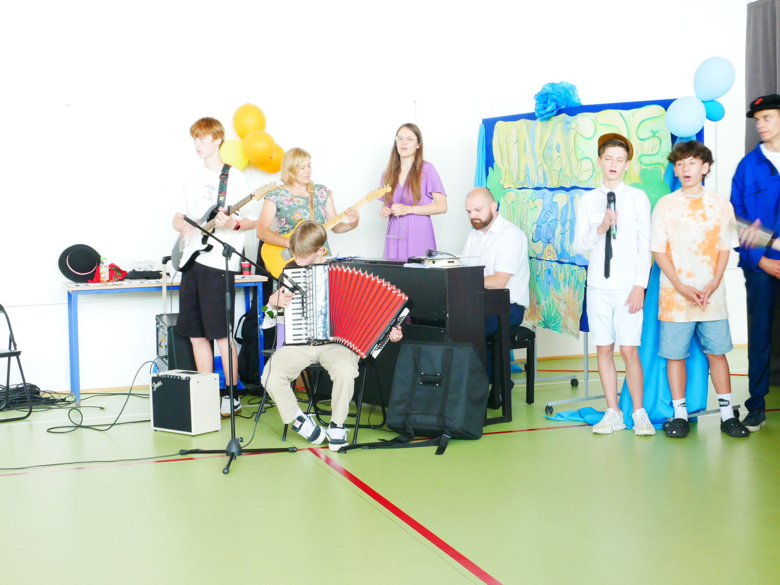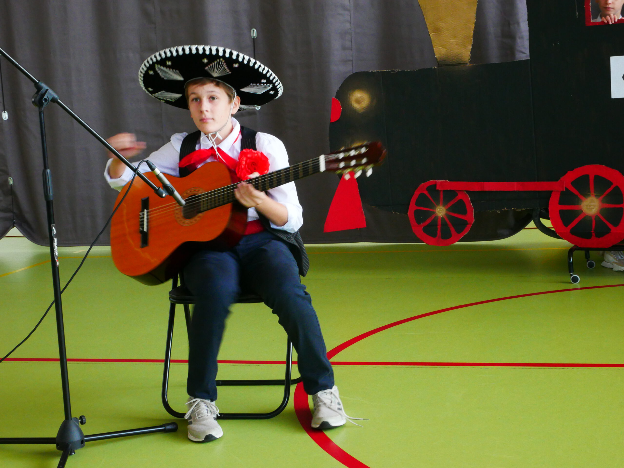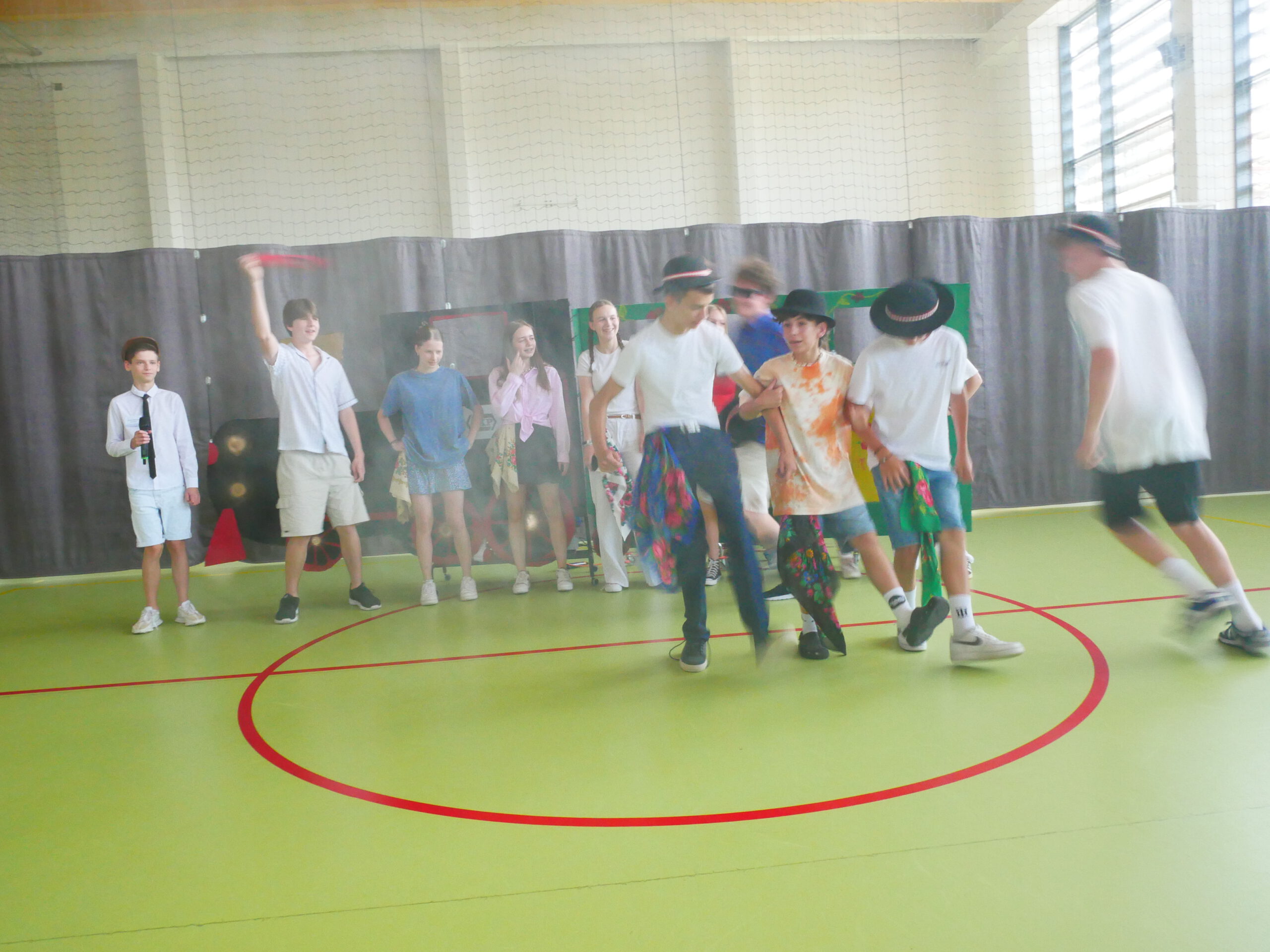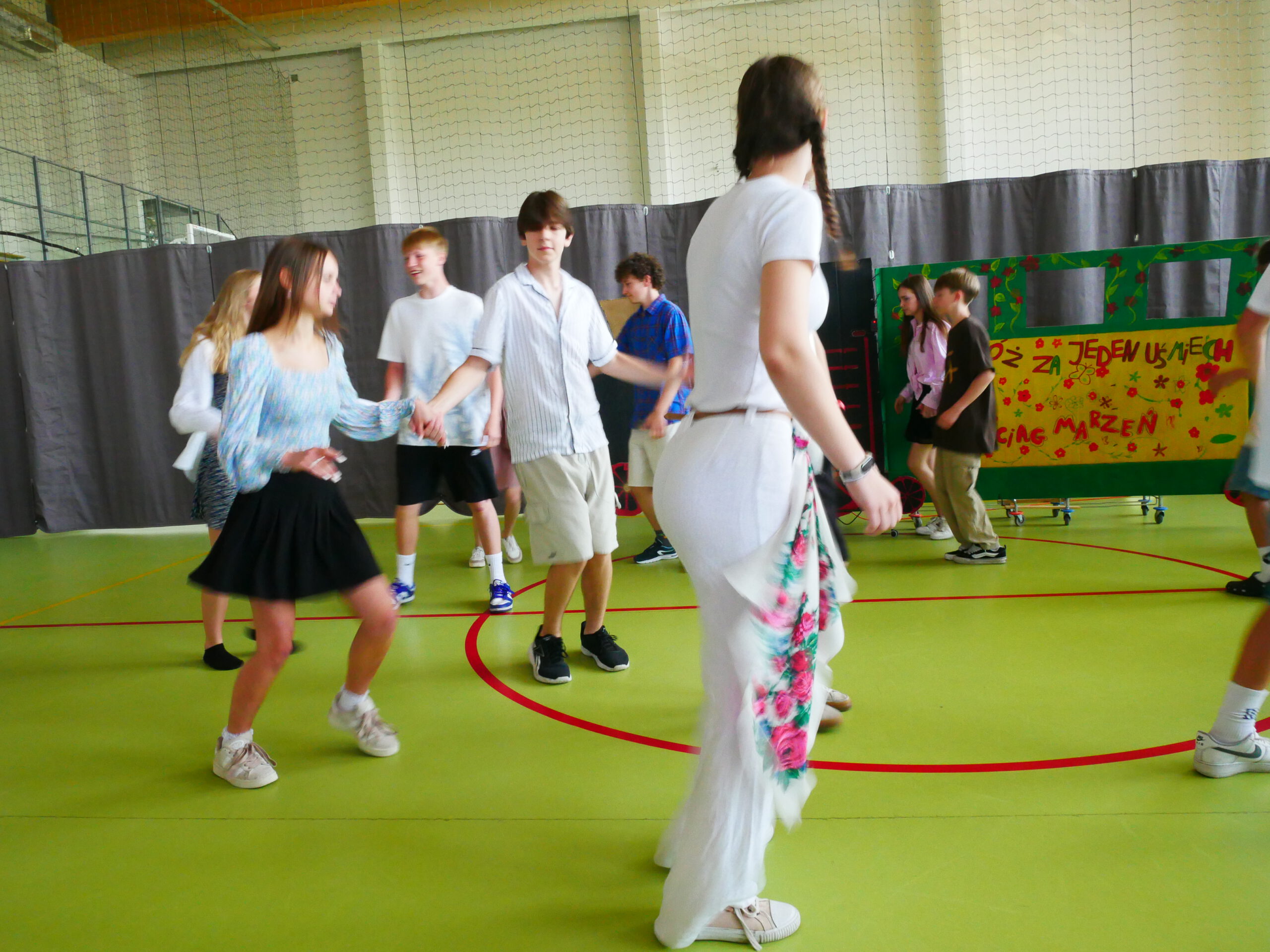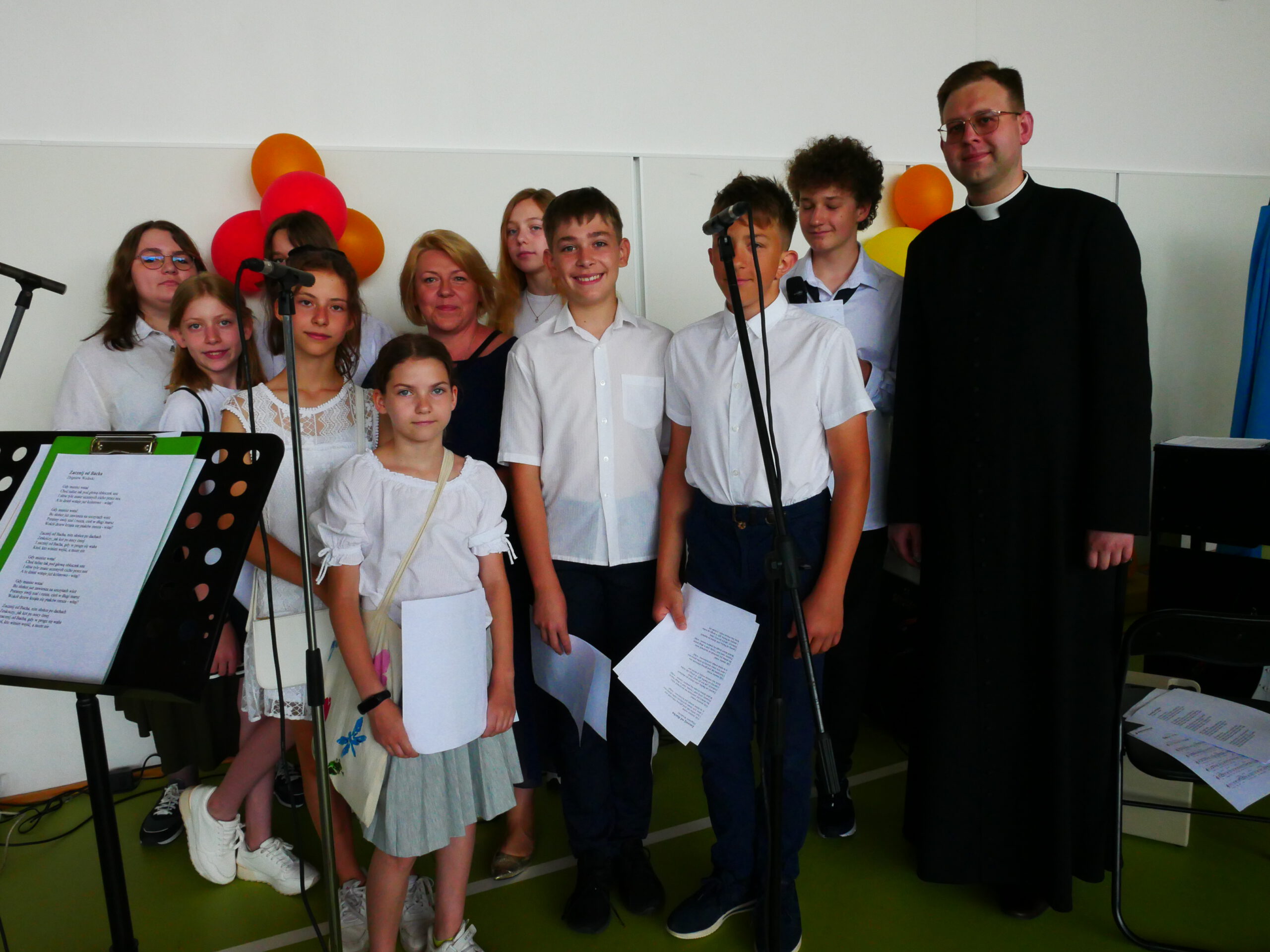 W dniu 21.06.2024 zakończył się rok szkolny. Uczniowie klas 7 razem z młodszymi koleżankami i kolegami przygotowali przedstawienie, w którym pociąg za jeden uśmiech odwiedzał różne miejscowości turystyczne. Uroczystość uświetnił występ chóru szkolnego.